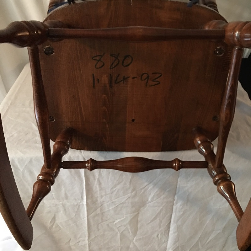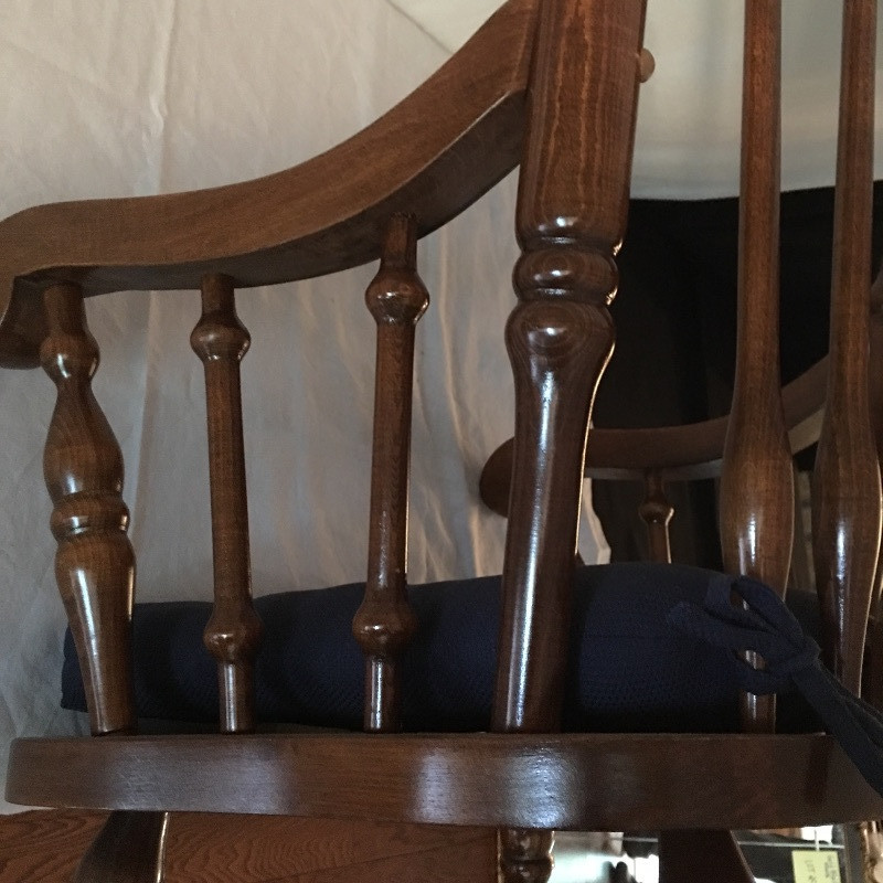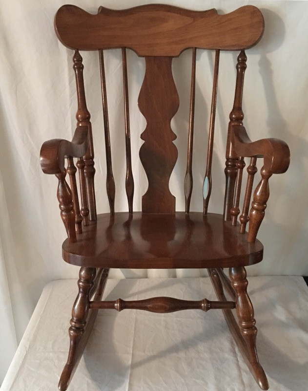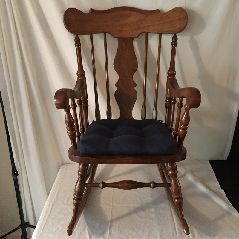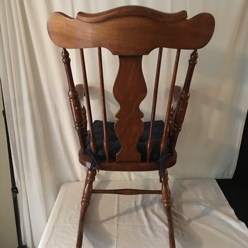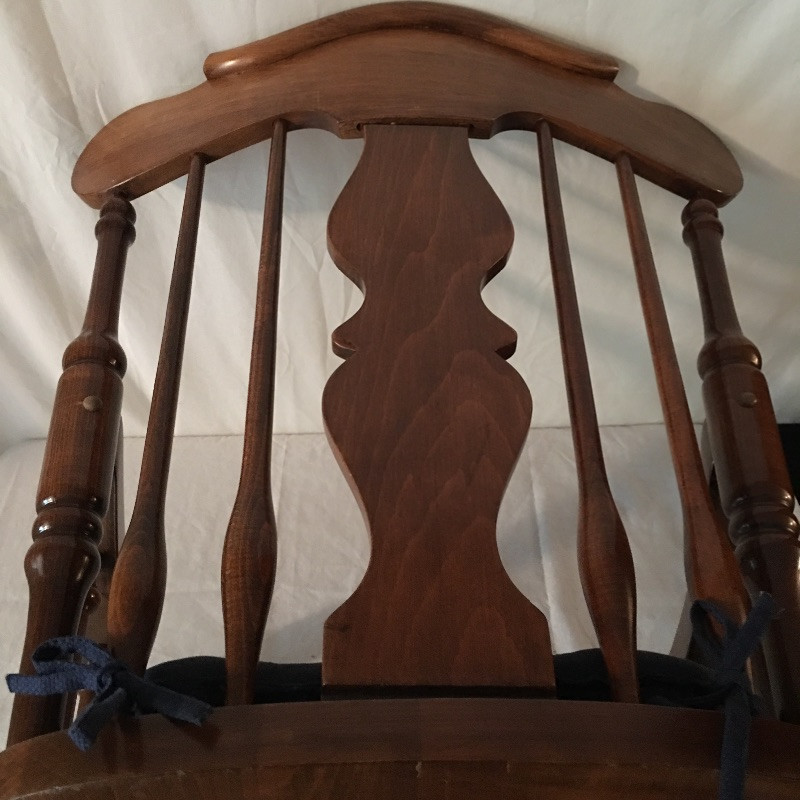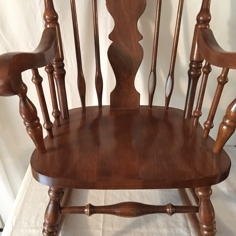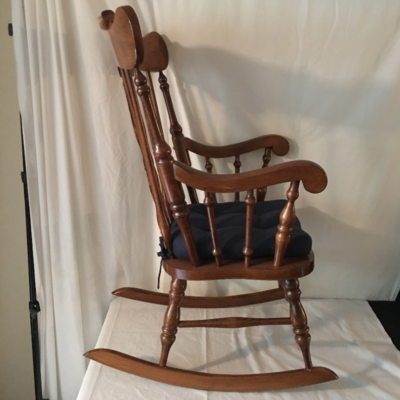 This Wooden rocking chair is in great condition and will add old world charm to your space. It has a lovely classic spindle design. Chair measures 26” x 29.5” x 41”.