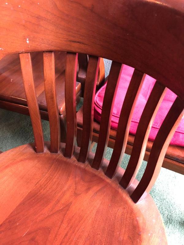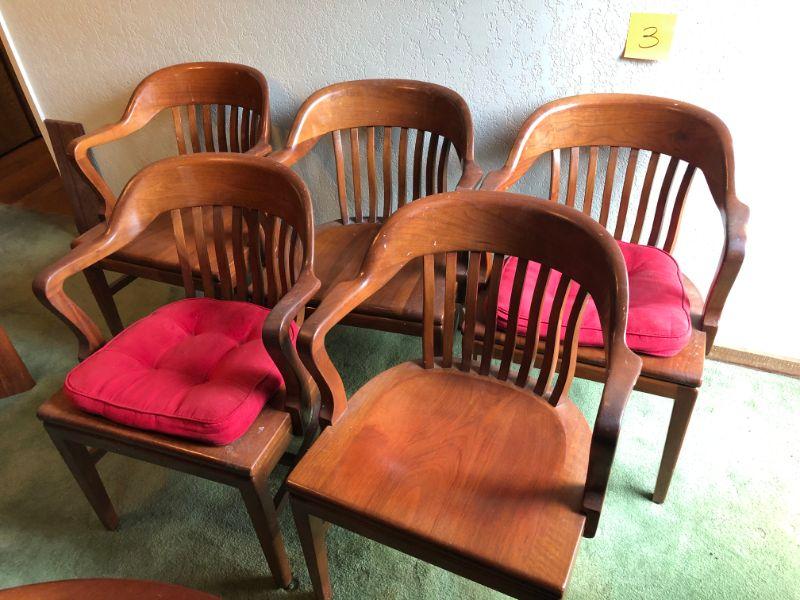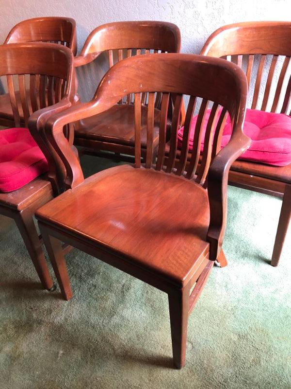 Set of 5 heavy duty wooden mission style chairs from an old library or train station.