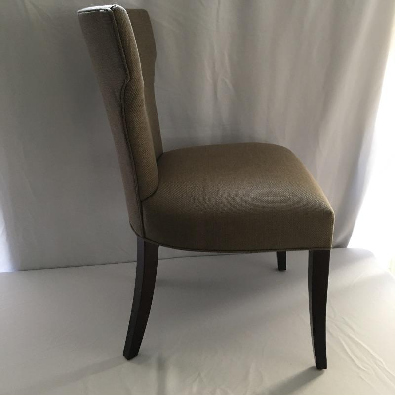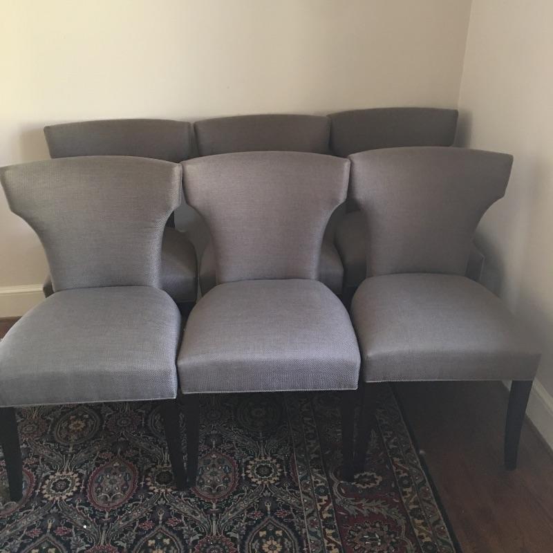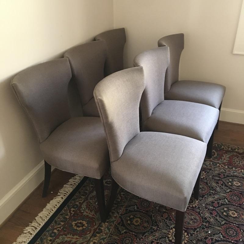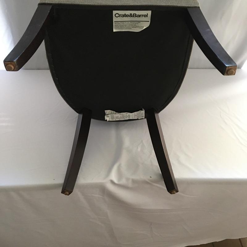Six Crate and Barrel upholstered chairs. Chairs are in excellent shape and have a unique shape. A great set of chairs that you won’t be in a hurry to leave when dining. Chairs measure 21” x 22” x 36” with a 20.5” seat height. No noticable wear on any of them and no sagging on the seats found.