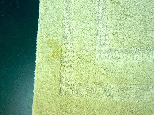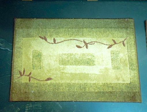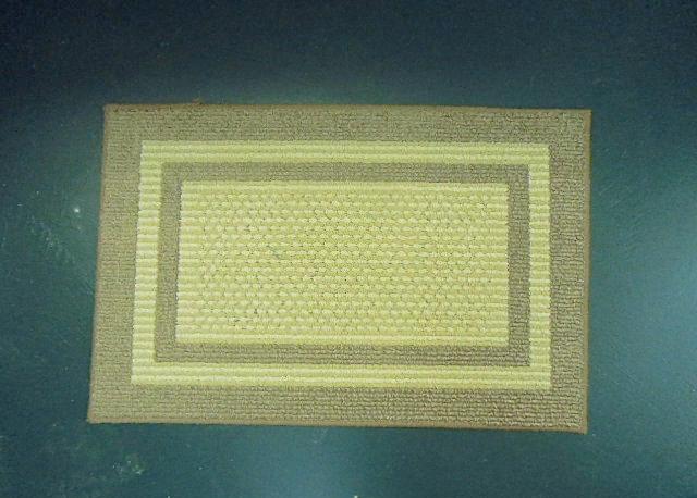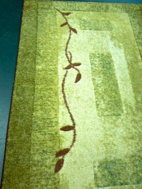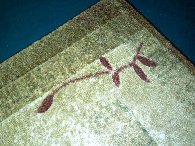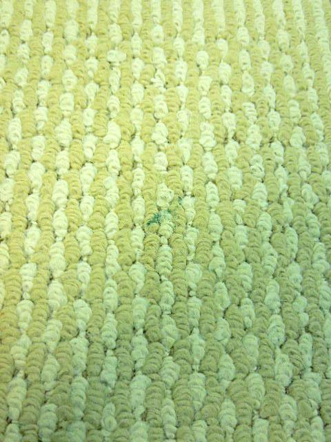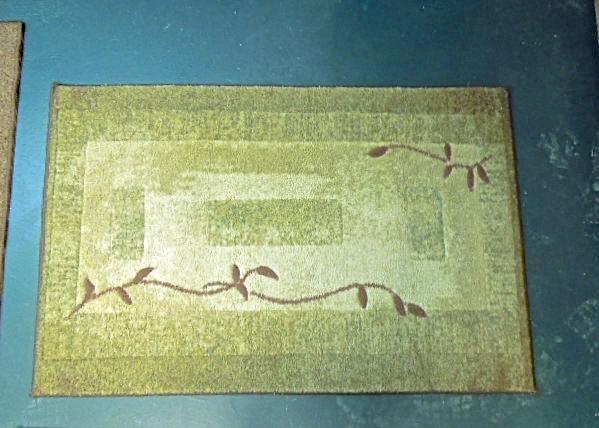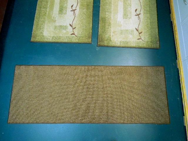 Two ecru textured acrylic 27 x 47 ; two 40 x 26 green with brownish red vine pattern; 22 x 60 runner brown; 20 x 30. Ecru rug with geometric cut blocks is stained. (see photos) Need cleaning. Pet hair. No strong musty odor.