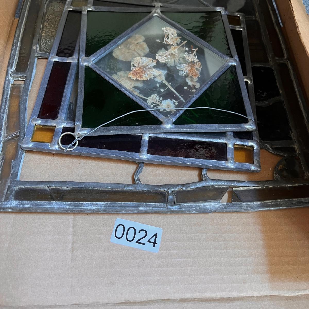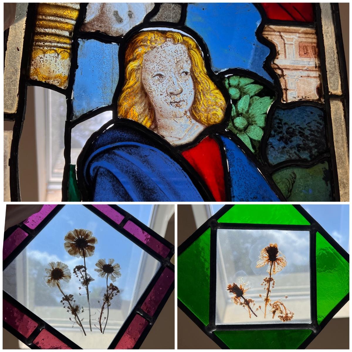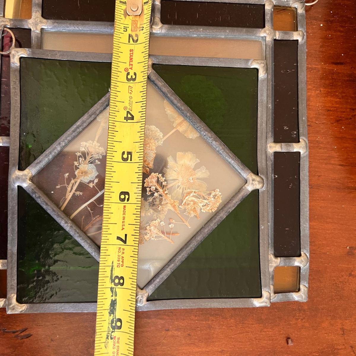 3 stained glass pieces, 2 with dried flowers in the center. Note the larger one has missing glass panels and some damage. But it is still just a beautiful piece! See all pics for conditions and sizes.