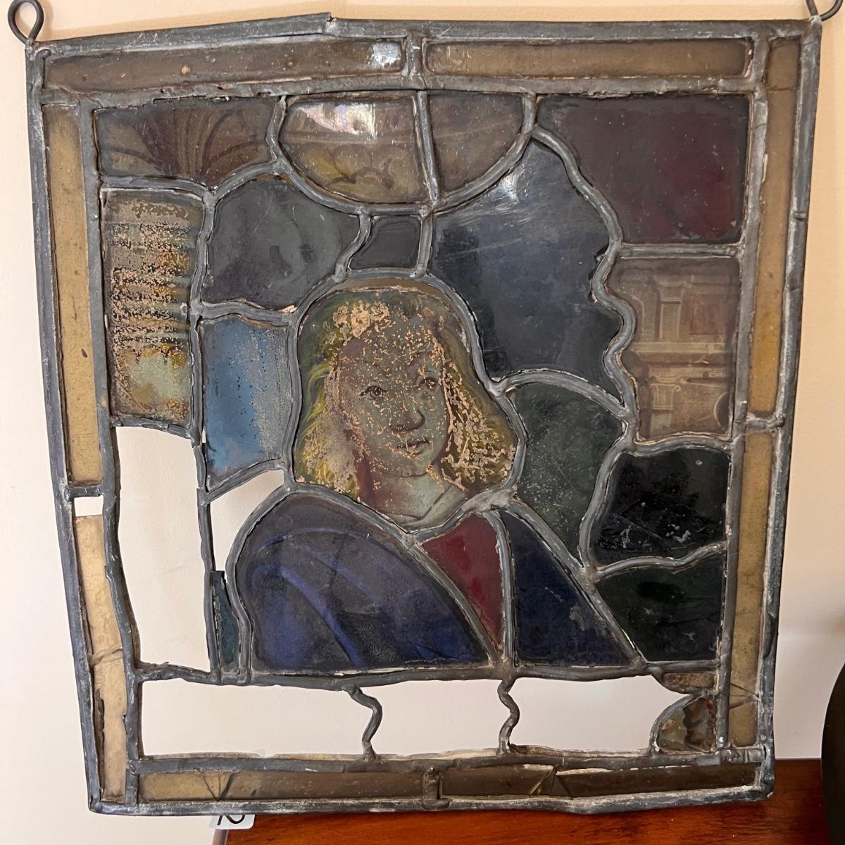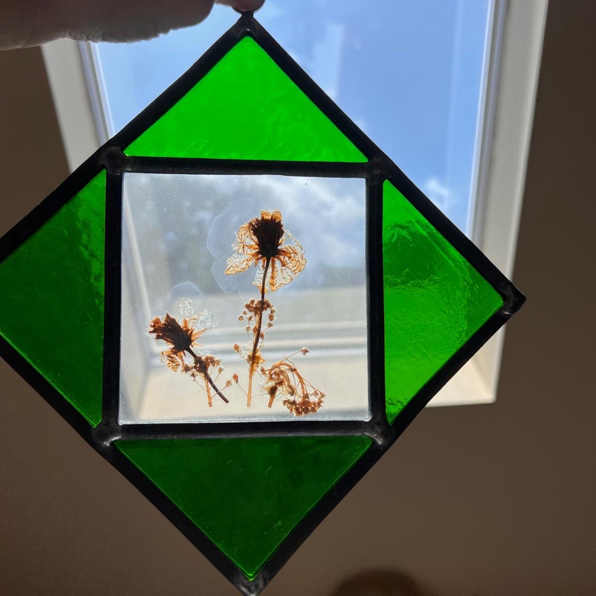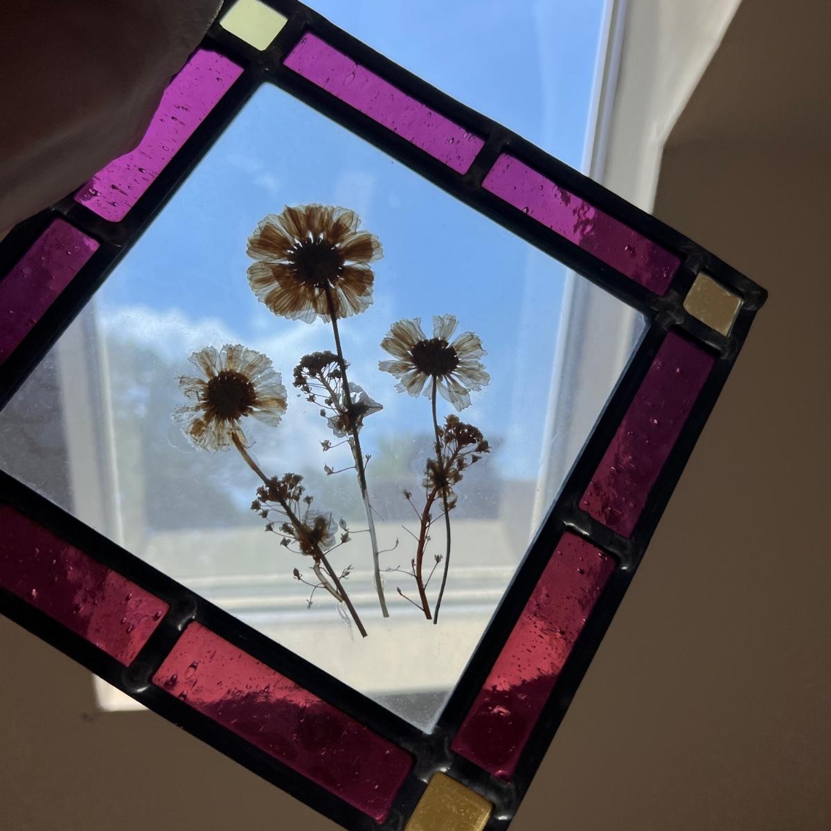 3 stained glass pieces, 2 with dried flowers in the center. Note the larger one has missing glass panels and some damage. But it is still just a beautiful piece! See all pics for conditions and sizes.