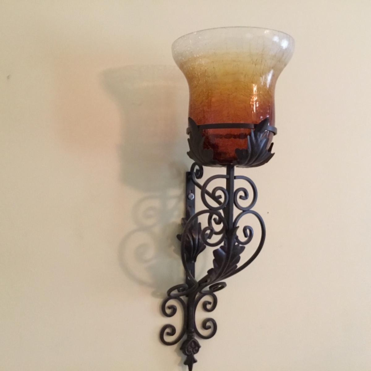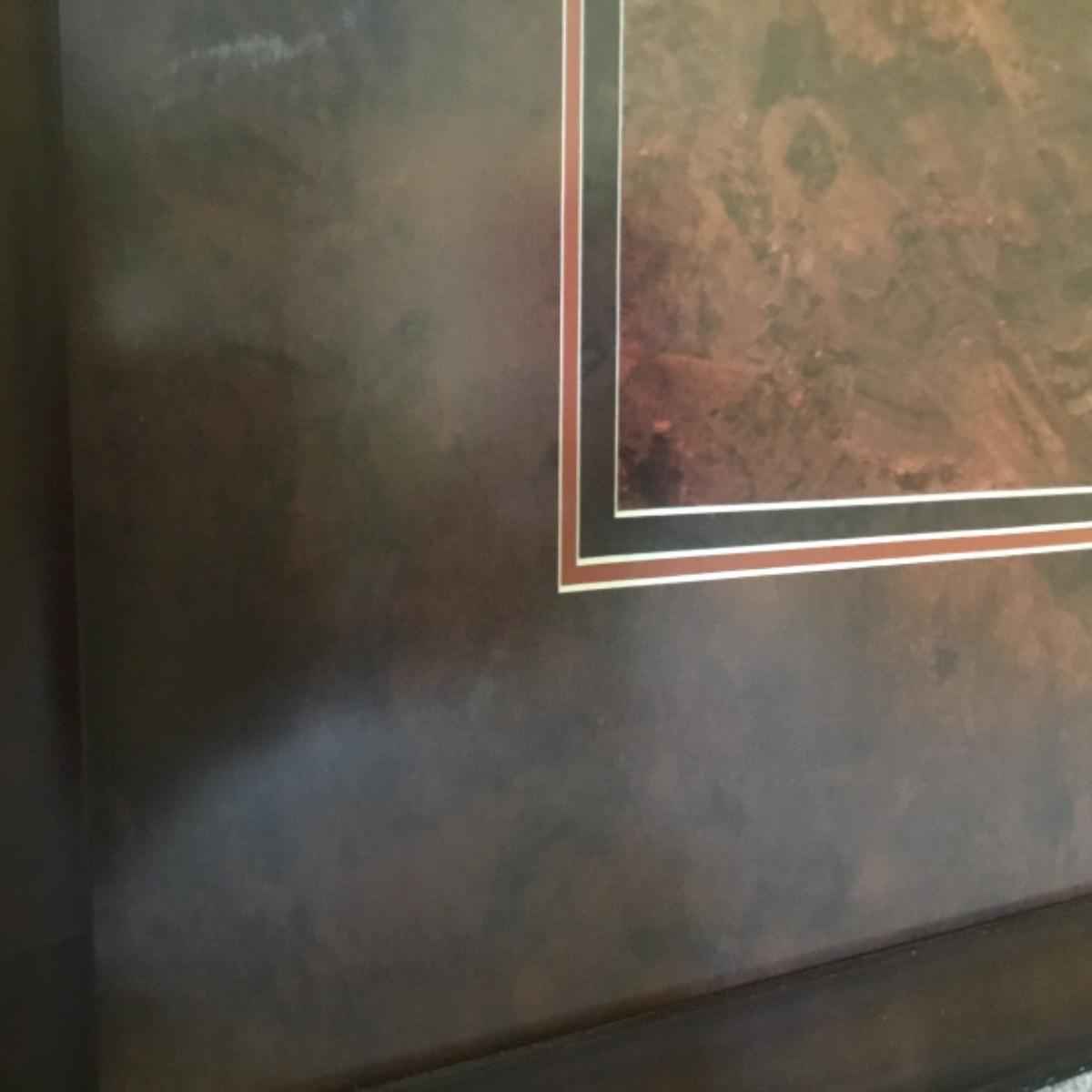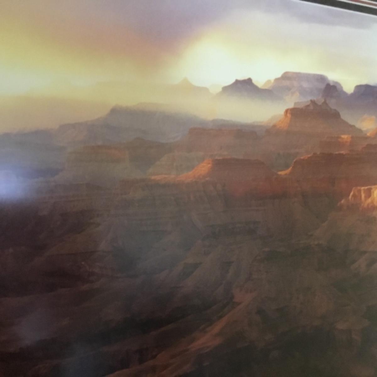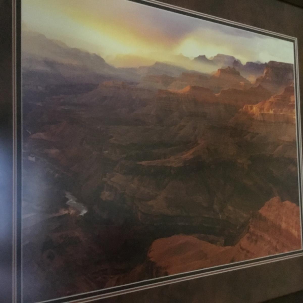 Lot includes a stunning image of the Grand Canyon matted and framed with measurements of 41.5”x35”. Print is behind plexi-glass, there is no signature but “˜October 16, 2005’ is written on the print. Two sconces are approx. 16” vertically tall. Glasses can be removed from the mount. See photos for details. Local pickup only.