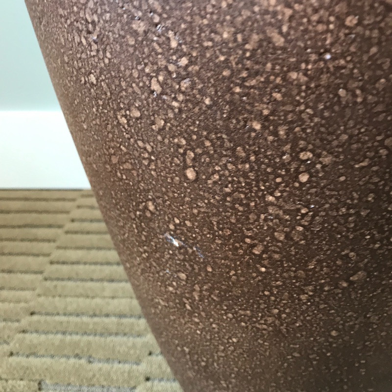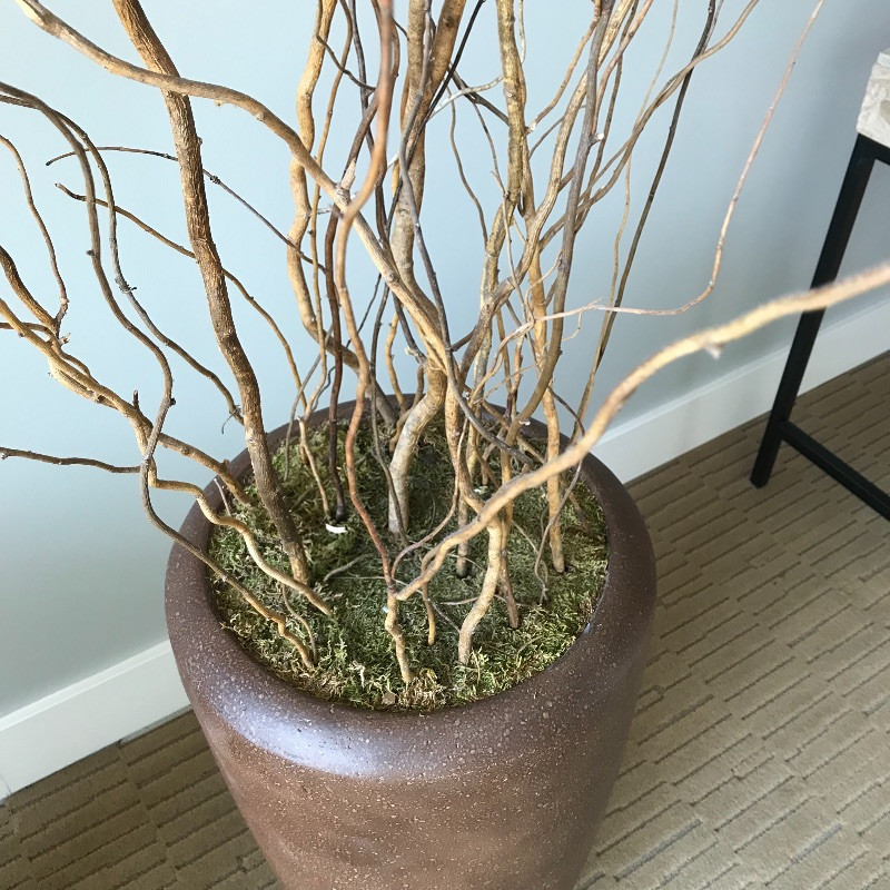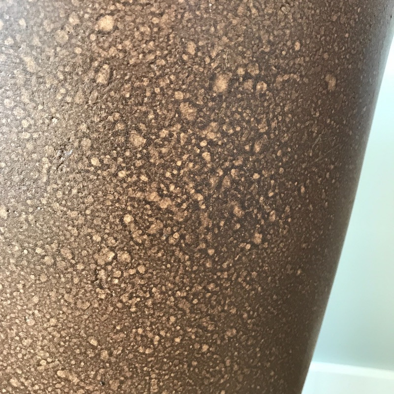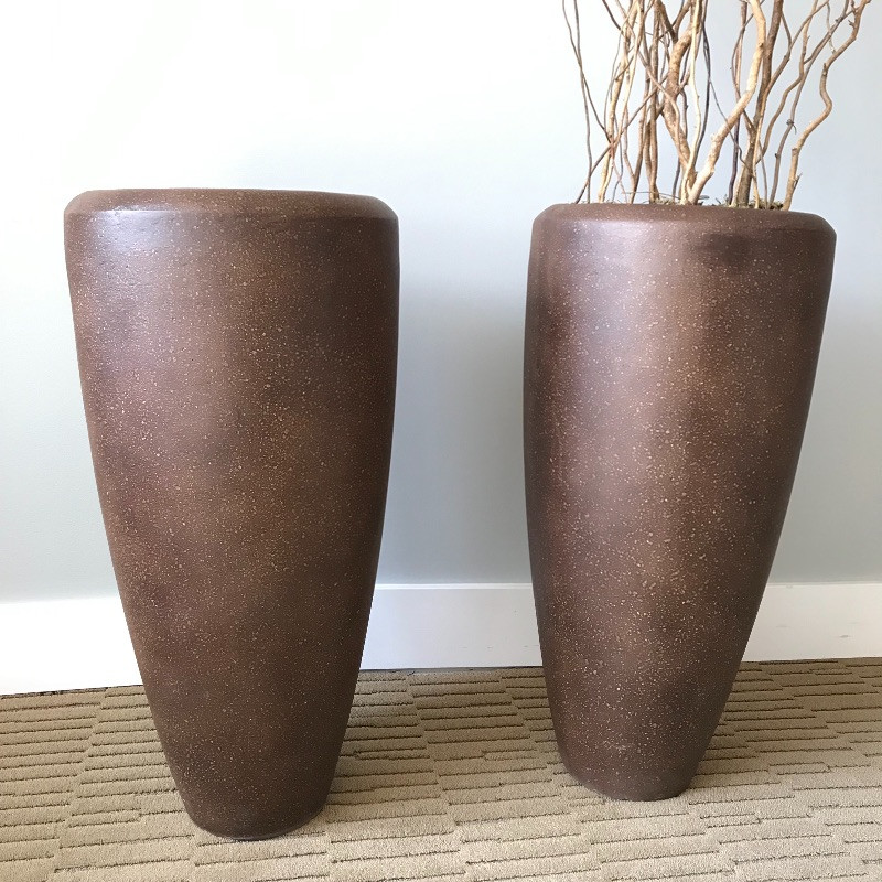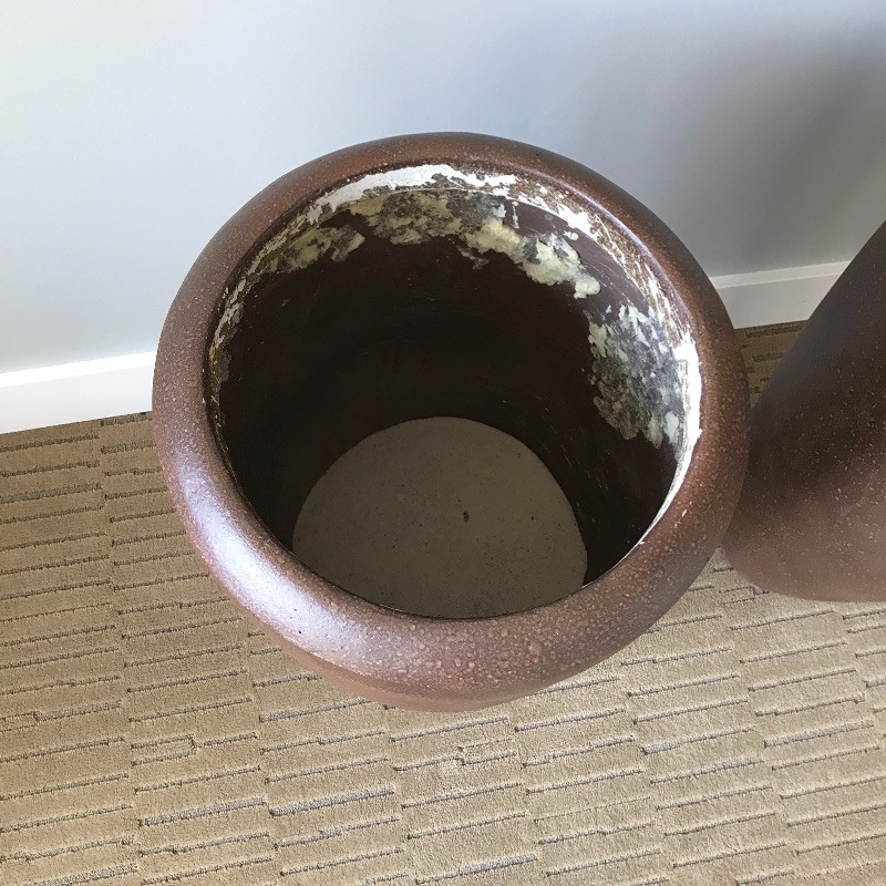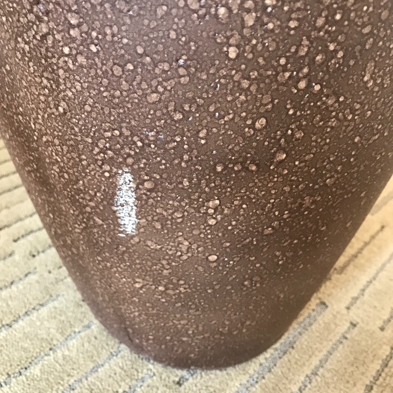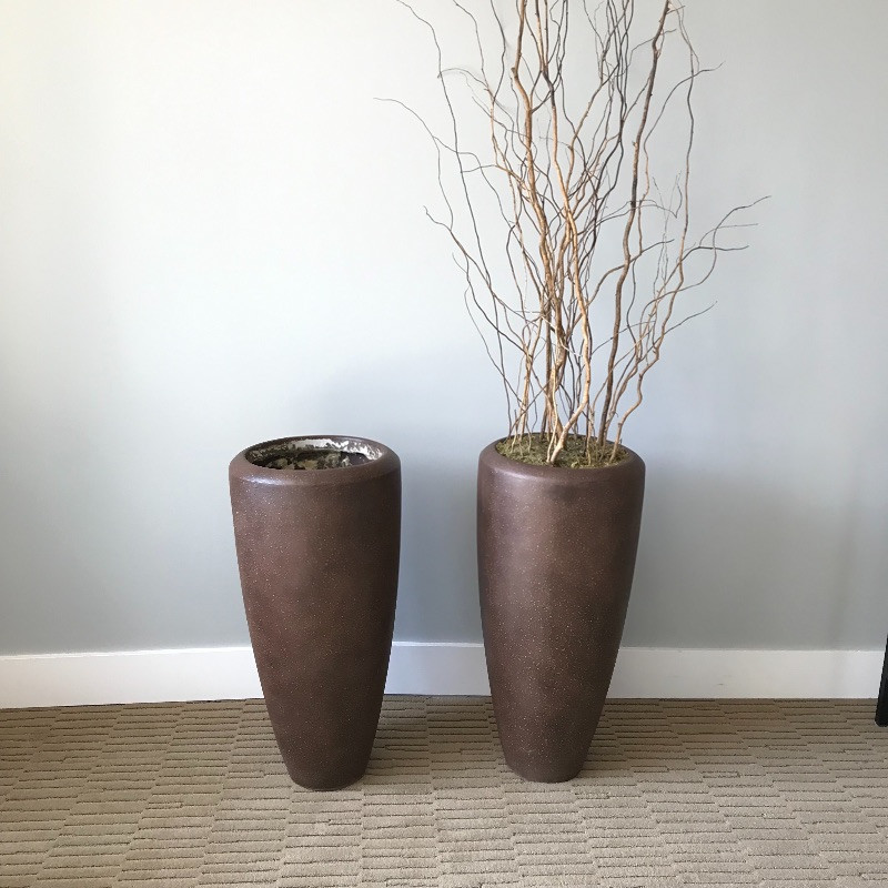 These two brown speckled urns would look great in an entrance way or add elegance to any space. The willow sticks can be easily removed as you will see in the empty one (which actually has sand in it now). Each piece has one scuff mark as noted in the images. Each Urn stands 30” and 14” at the top widest part and they taper down from there.