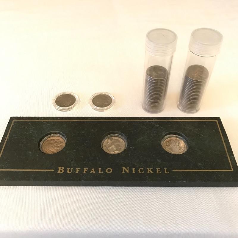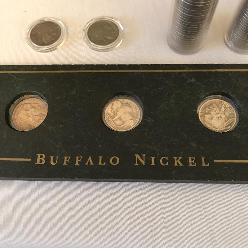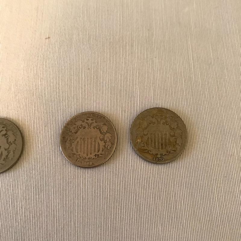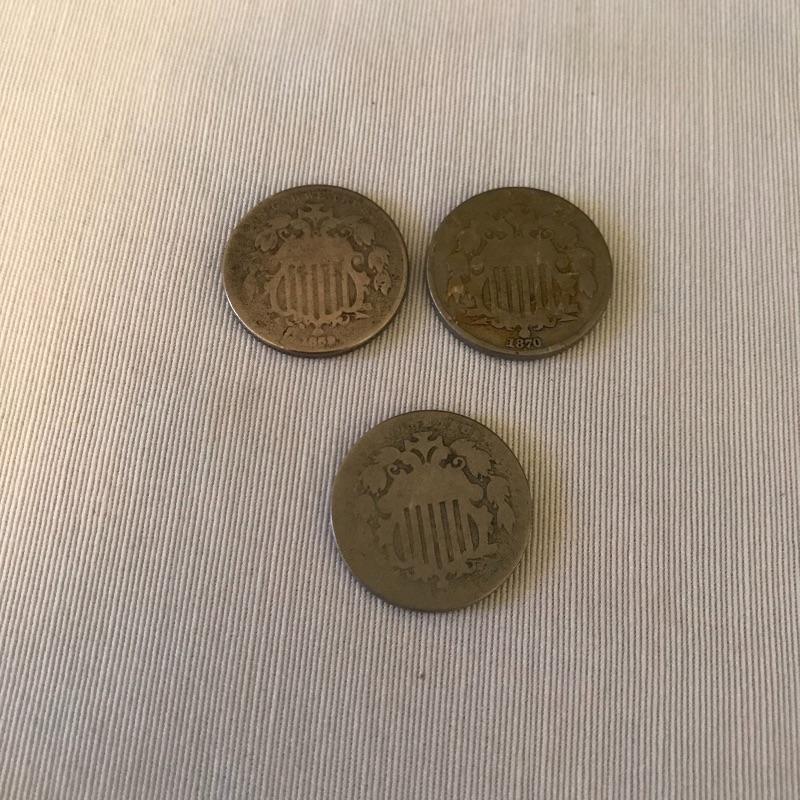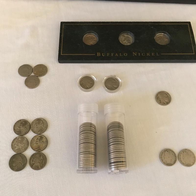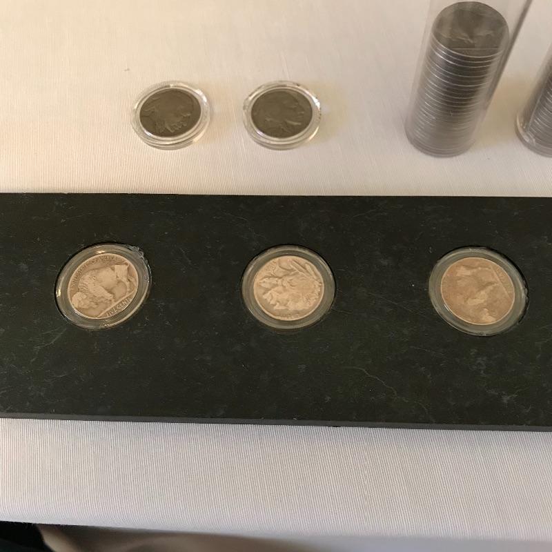 The majority of the lot are Buffalo Nickels, including one from 1918. The display of three have two 1936 and one 1937 Buffalo Nickel. Six War Time Alloy Nickels dated 1943-45. Two Liberty Head Nickels with dates 1902 and 1907. Lastly, three Shield Nickels. One’s date is unknown, one appears to be 1868 or 9 and the final one is a clear 1870.