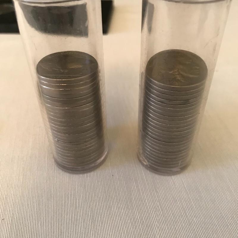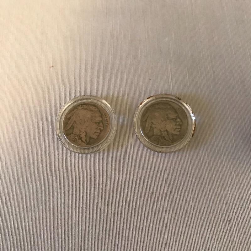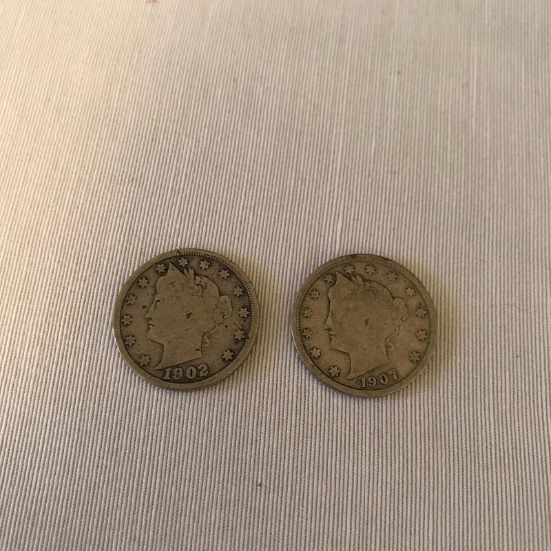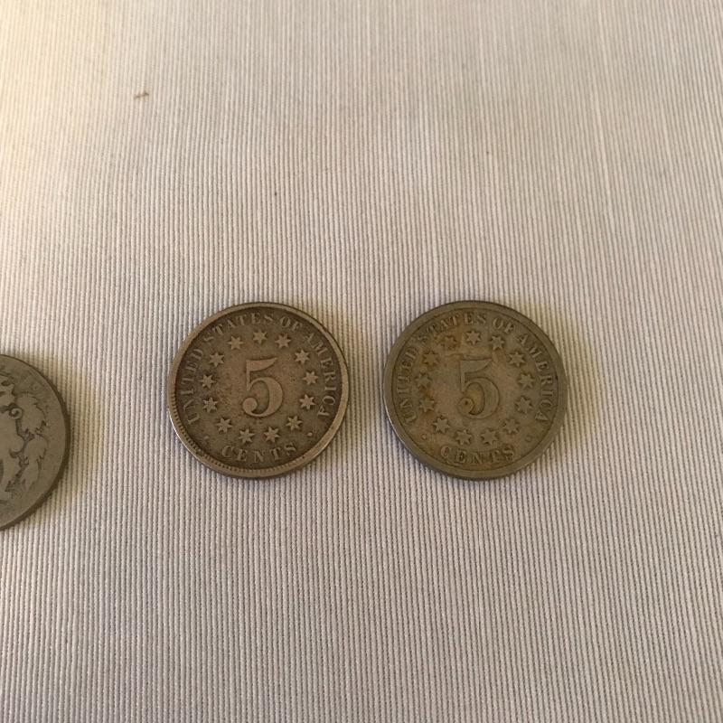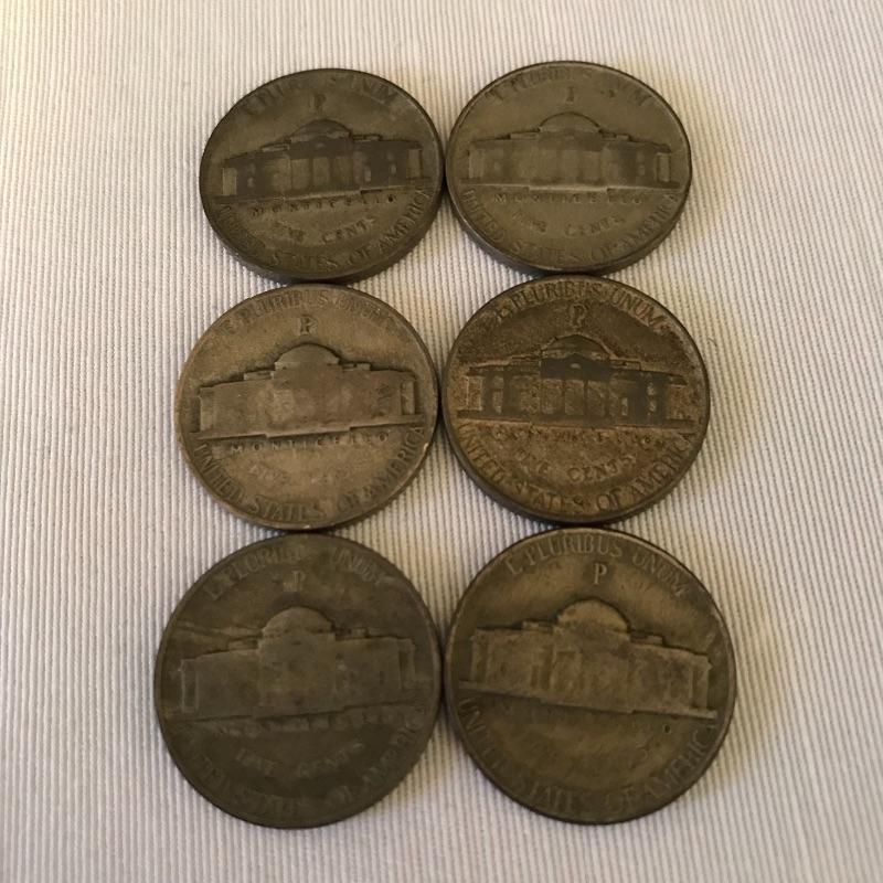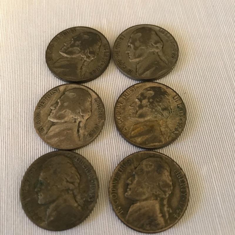 The majority of the lot are Buffalo Nickels, including one from 1918. The display of three have two 1936 and one 1937 Buffalo Nickel. Six War Time Alloy Nickels dated 1943-45. Two Liberty Head Nickels with dates 1902 and 1907. Lastly, three Shield Nickels. One’s date is unknown, one appears to be 1868 or 9 and the final one is a clear 1870.