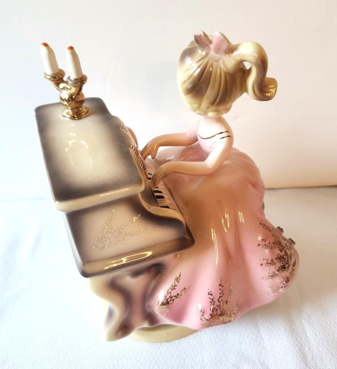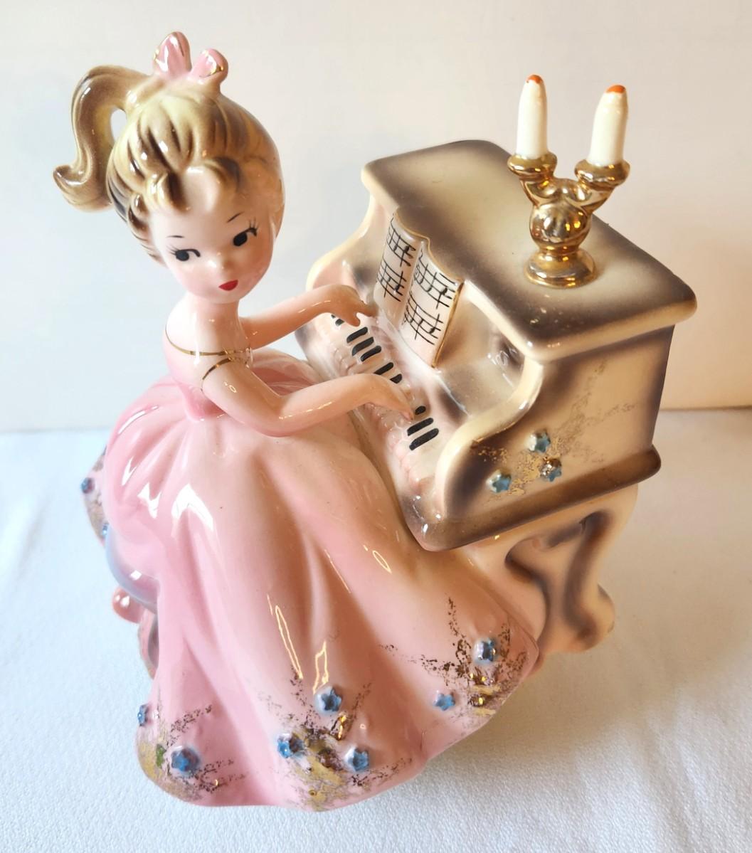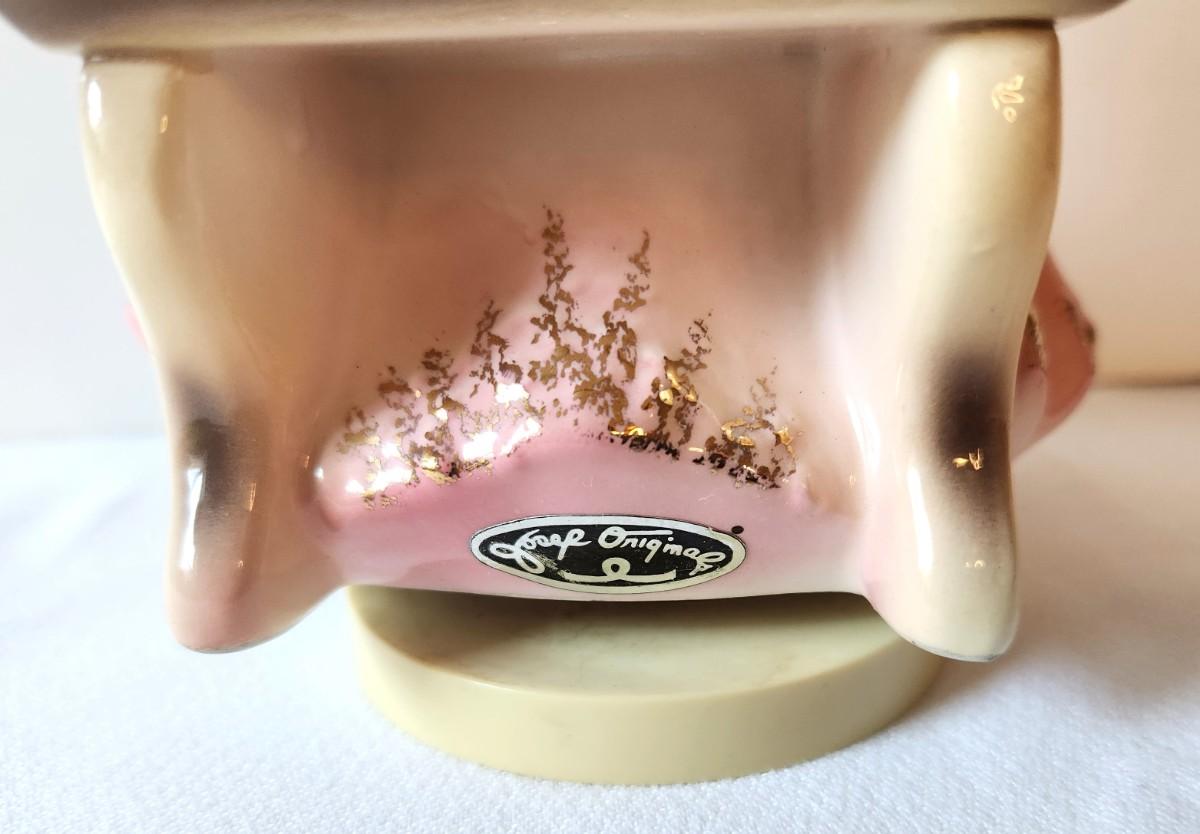 Sweet vintage (dates from 1956) Josef Originals music box. Great condition - works. Hard to find in this condition - usually the little candles are broken off. Still has original sticker. Made in Japan. 6" tall.