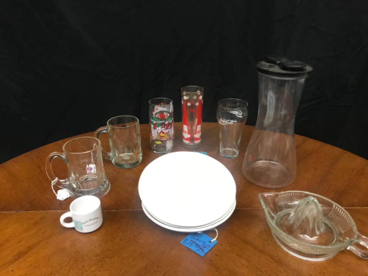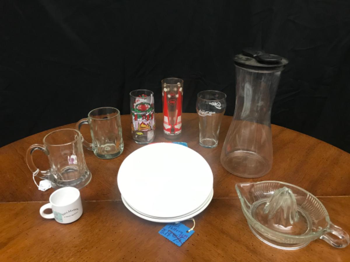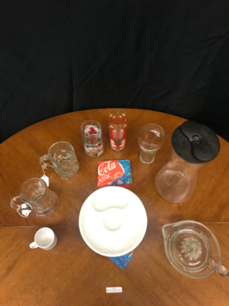 kitchen:lot 3 vintage artichoke plates, vintage glass juicer, cappuccino cup, coca cola wallet, plastic storage container with lid, 2 vintage beer mugs, coca cola glass, vintage DQ glass, santa glass;