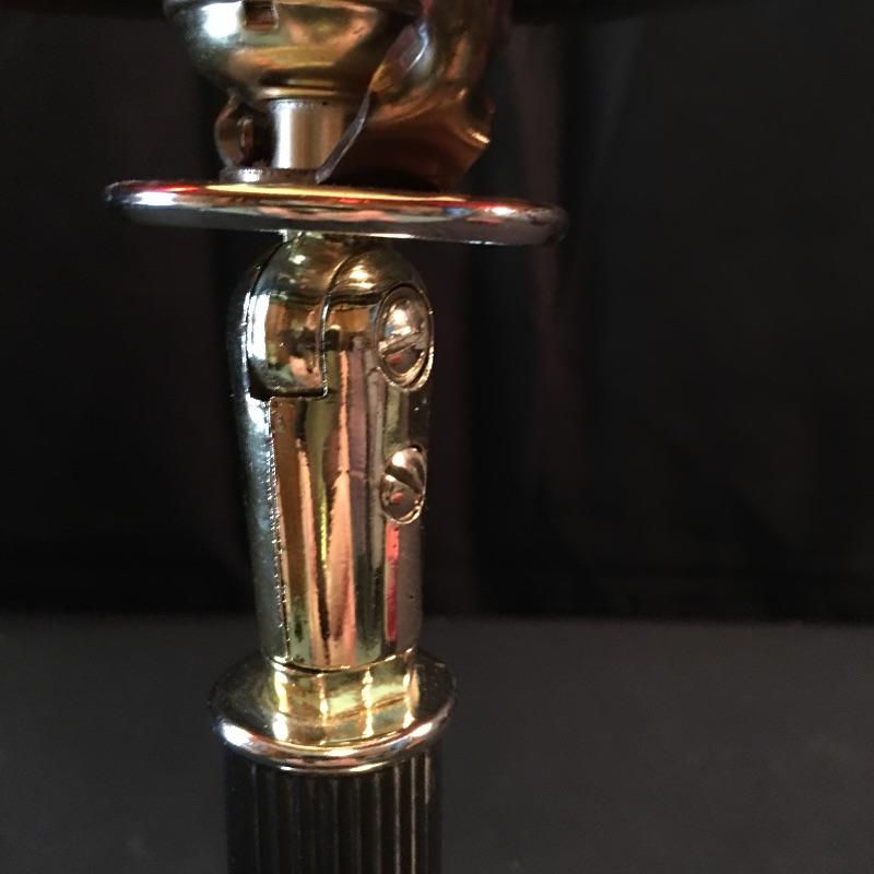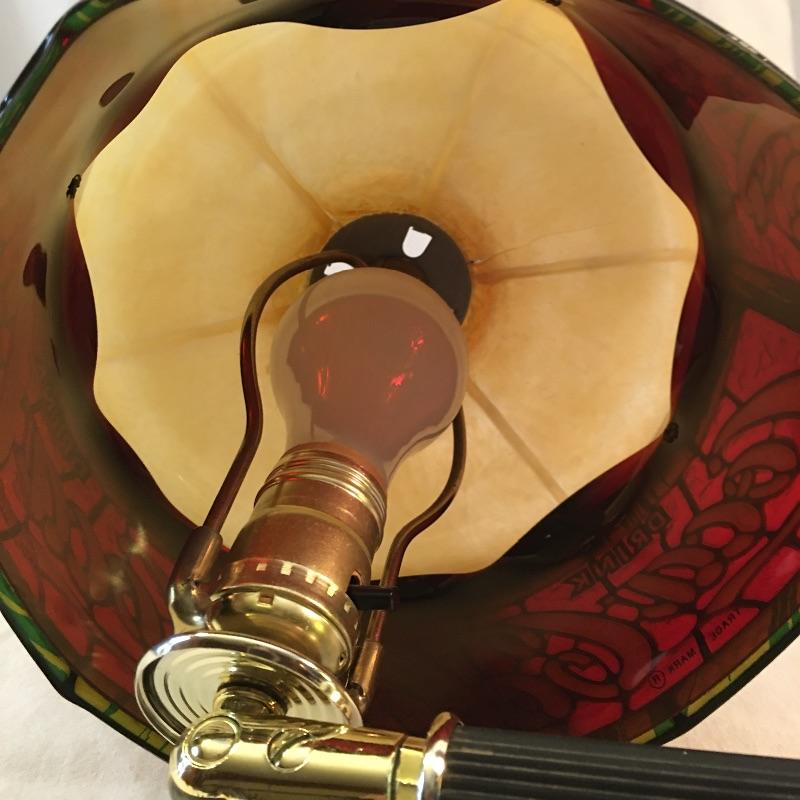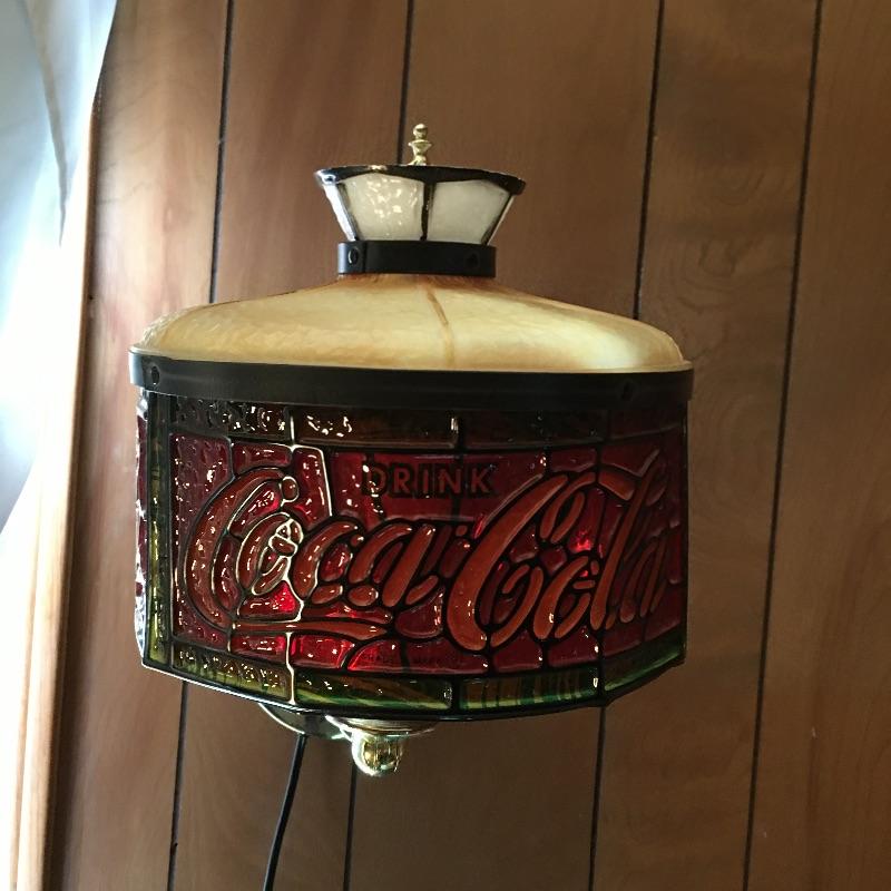 This is a great vintage find for all you Coca Cola collector’s. You would not know that this piece is plastic, it truly appears to be stained glass unless you touch it. This versatile lamp can be mounted on the wall or be a table lamp; the quick install for the wall mount comprises of a basic metal plate that is included. The metal brass colored stand has a hinge to angle the lamp for the wall mount or have straight as a table lamp by simply tightening the screw. There is a small crack in the shade that is shown in images.
