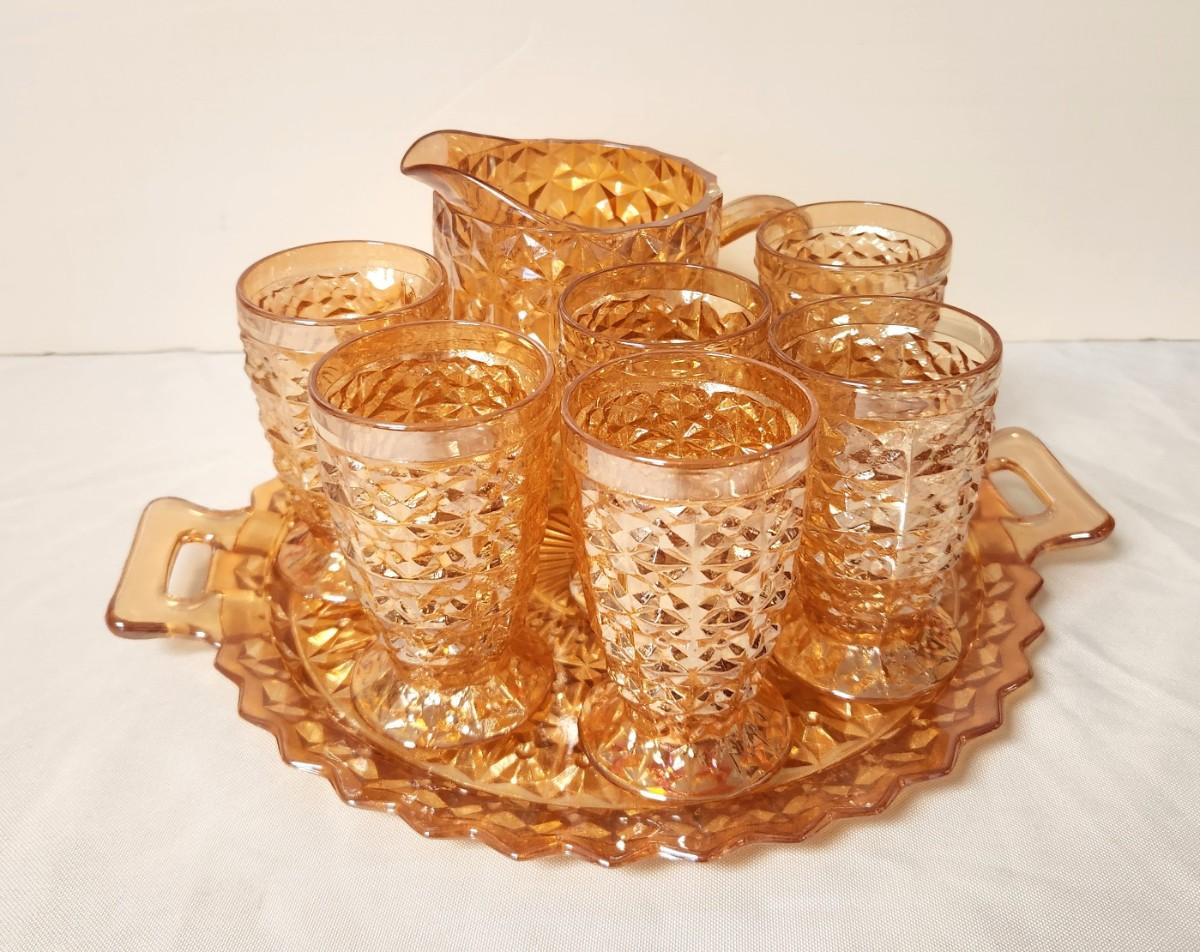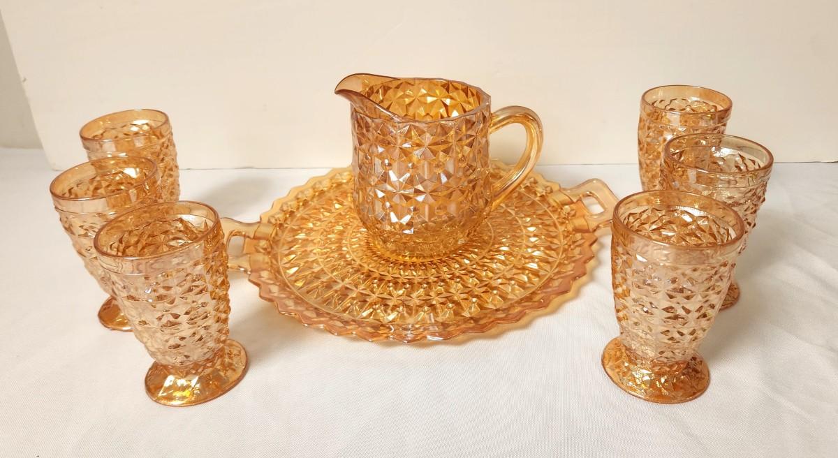 Looks as though it were never used! 1940's/50"s flashed Marigold Carnival Glass Lemonade set - pitcher, six glasses. underplate. Underplate is 12" across handle to handle, glasses 4" tall, pitcher 4.5" tall. Looks like new.