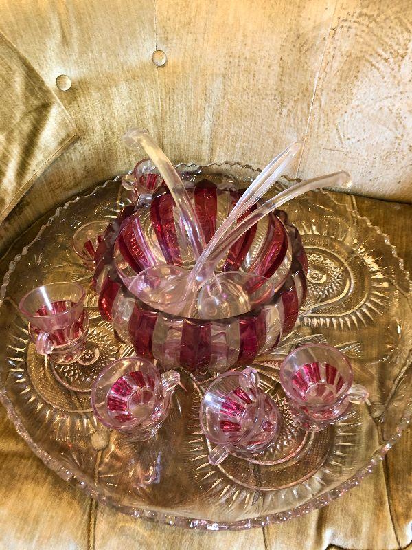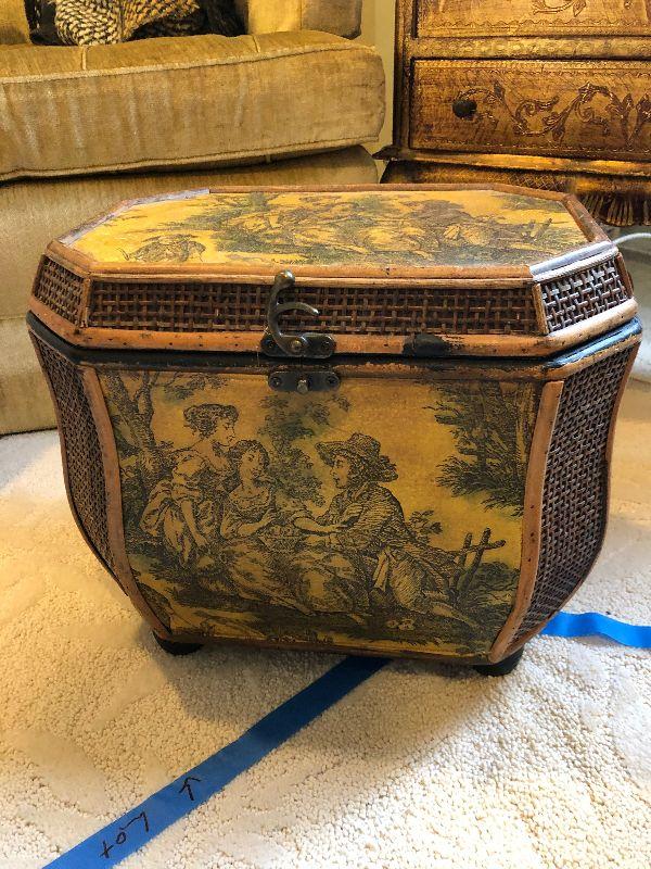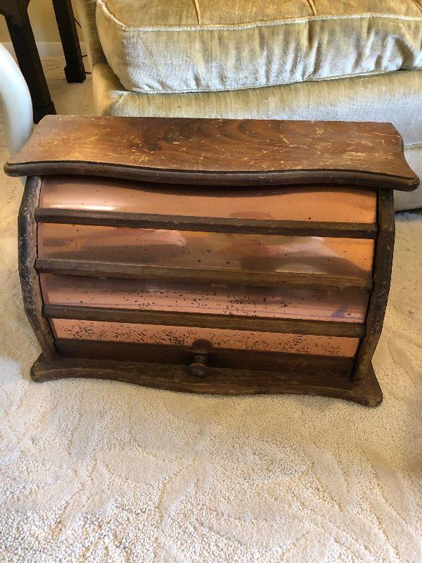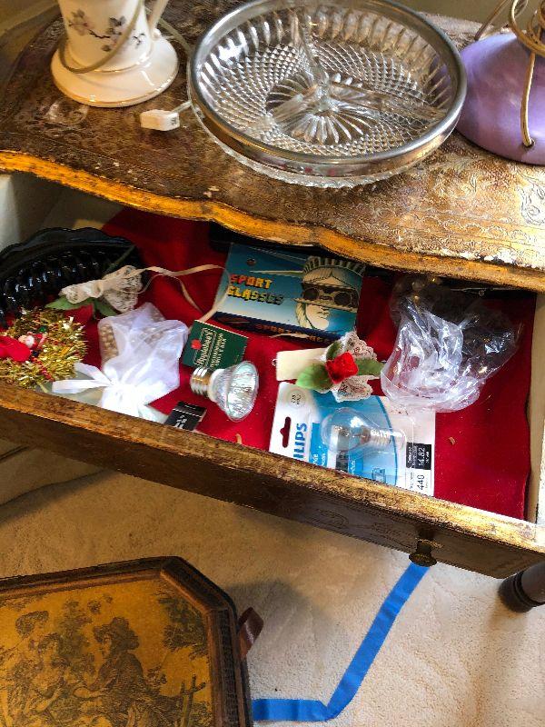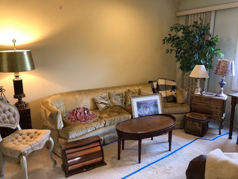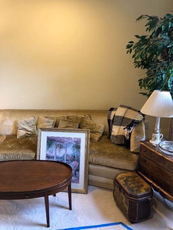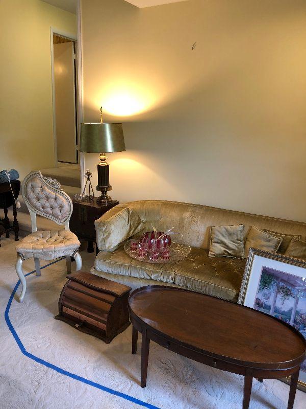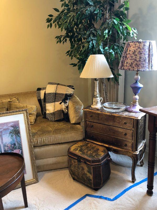 Vintage 93" curved gold velvet sofa, 2 decorative tables (oriental and provincial), chair, copper breadbox, punch bowl set (11 cups) with large crystal tray, 6' artificial tree and other miscellaneous items.