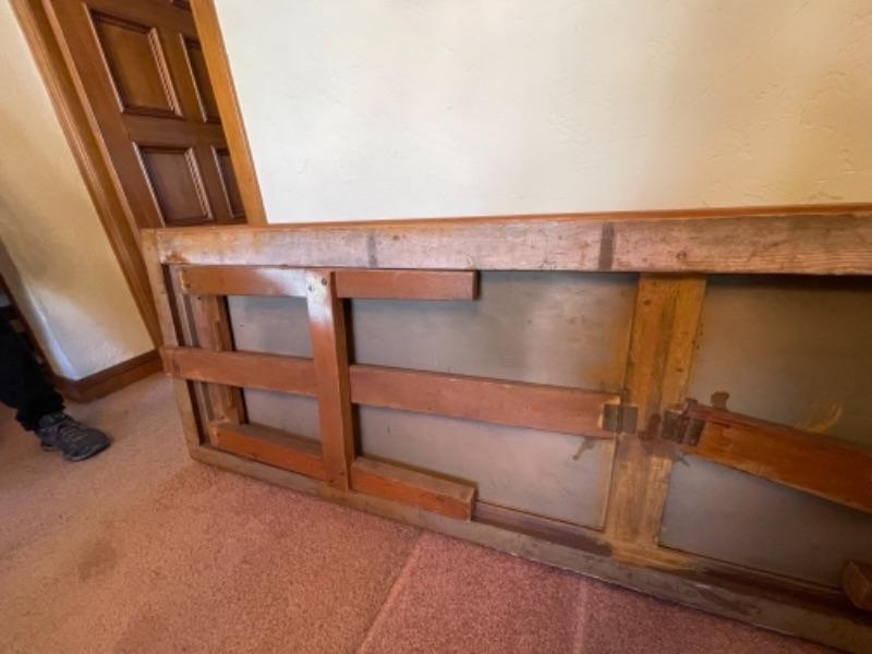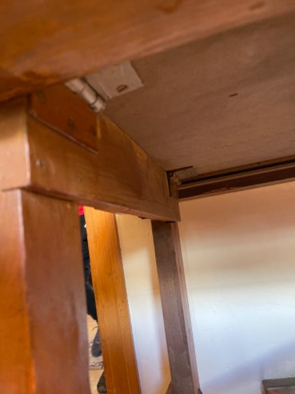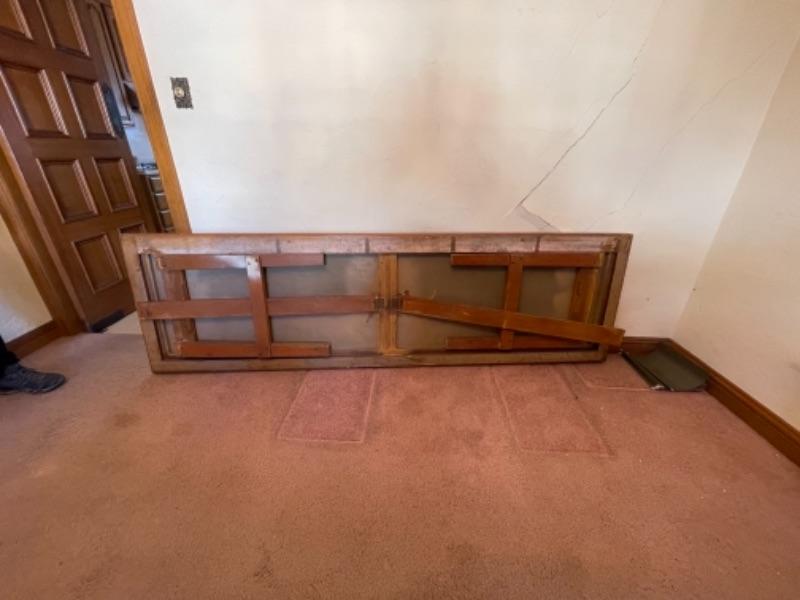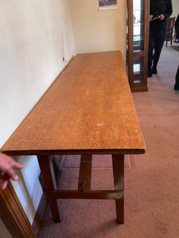 Lot 3. Vintage hand-crafted utility table, oak, folded, with locking legs, heavy duty, 96”x28”x30”--$75