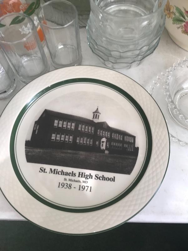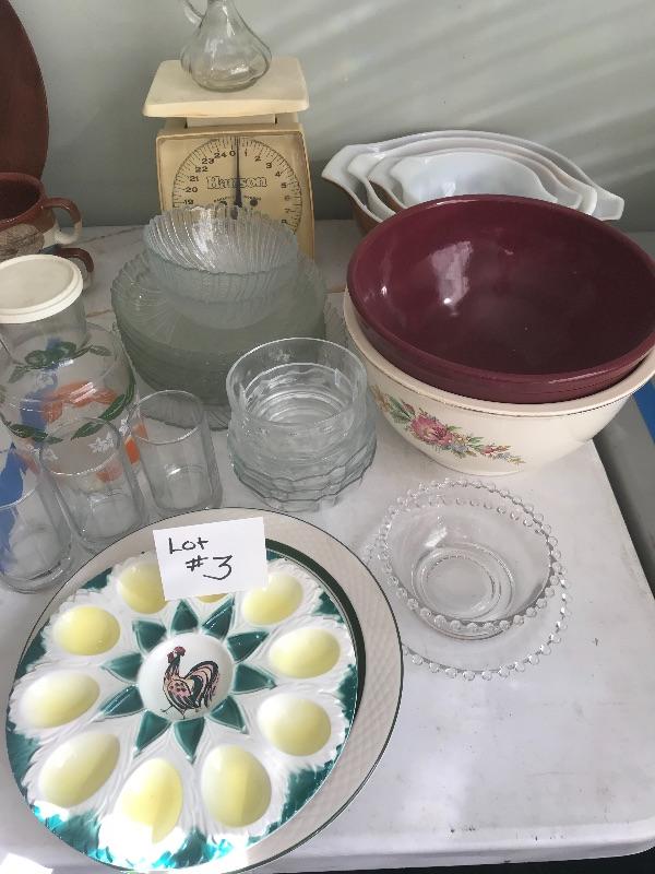 Vintage egg plate , pyrex set, mixing bowls Vintage St. Michaels High School plate, candlewick bowl, vintage salad set, vintage food scale
