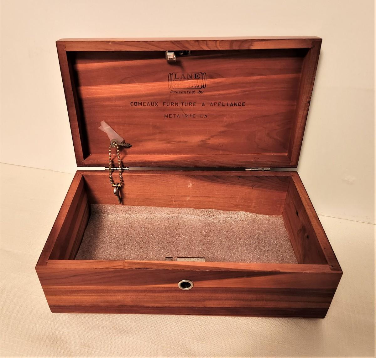 Back in the day, every girl that graduated from high school got on of these from the Lane Cedar Chest company - I still have mine!! 9" across, 3.25" tall, 5" deep - has a working key! This one came from Comeaux Furniture in Metairie. Good condition.