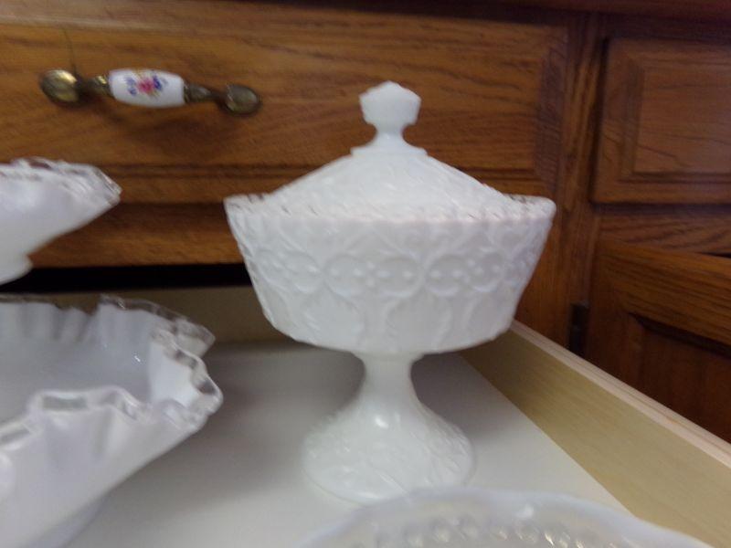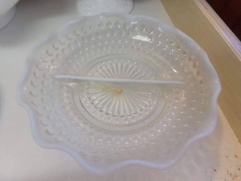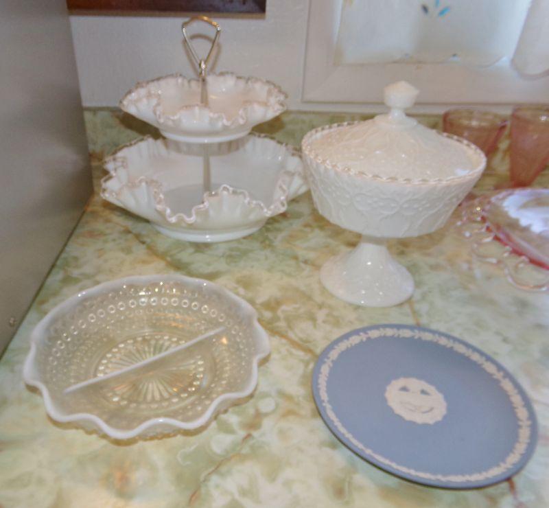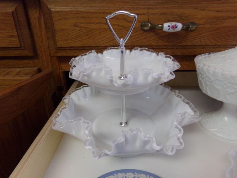 2 TIER RUFFLED EDGE SERVING DISH, MILK GLASS CANDY DISH, DIVIDED RUFFLED EDGE DISH, AND A WEDGWOOD PLATE