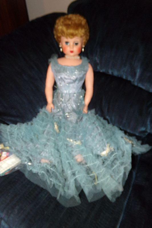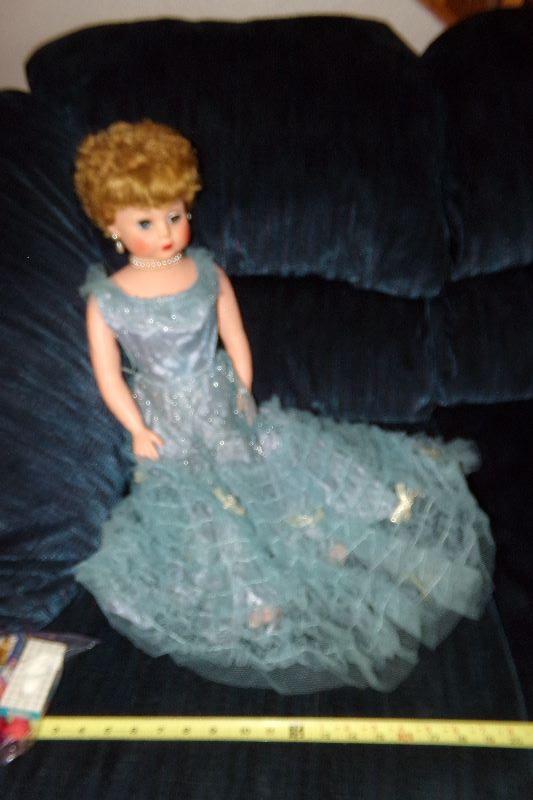 THIS DOLL HAS BLUE GOWN AND HER LEGS ARE PERMANENTLY CROSSED. I DON'T KNOW IF SHE WAS MADE THAT WAY OR IT HAPPENED WHEN BEING STORED FOR A PERIOD OF TIME