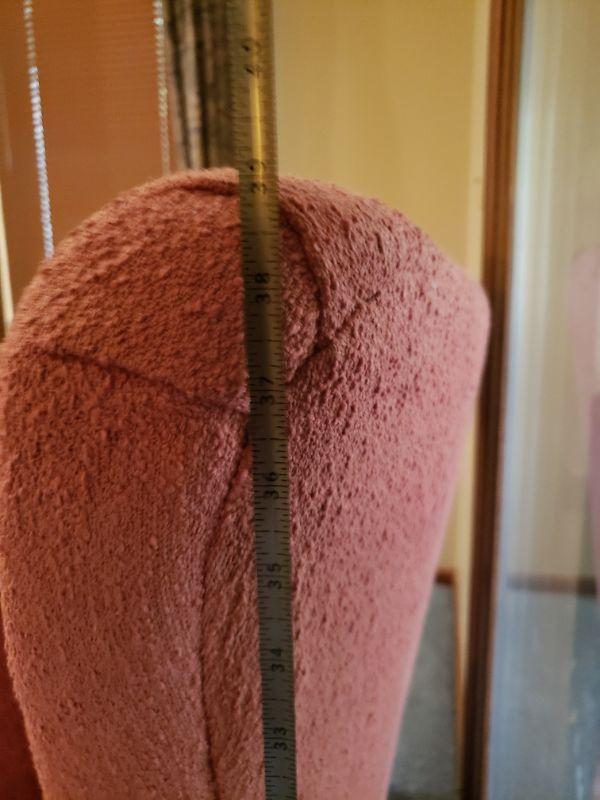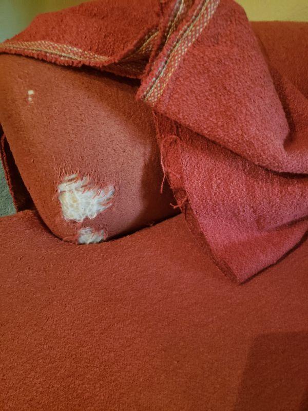 There is a hole on one arm. Chair comes with a swath of matching fabric to recover.