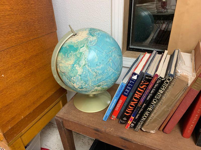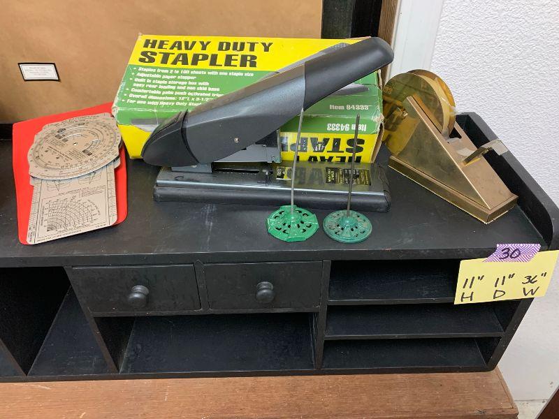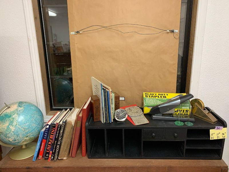 Black Desktop shelf, tape dispenser, globe, heavy duty stapler, westclox clock, pair of wooden bookends with ships engraved, nautical component, 2 green paper stabbers