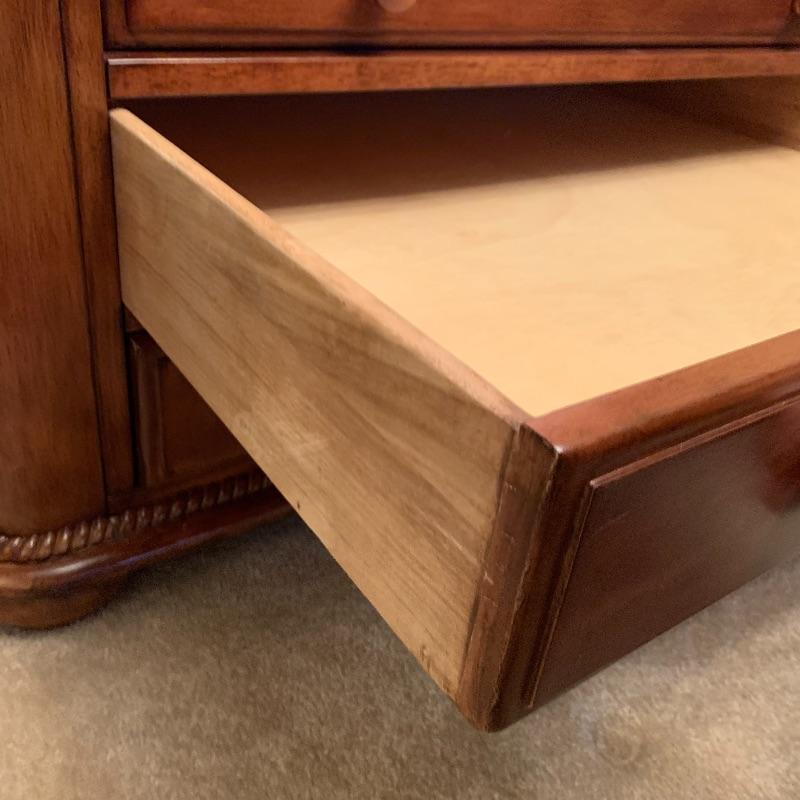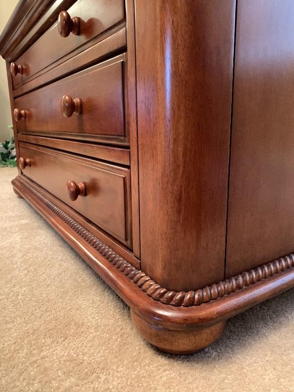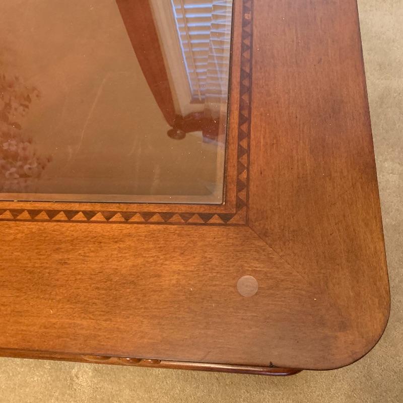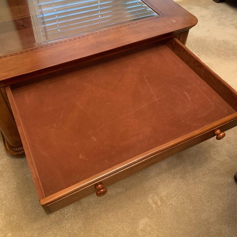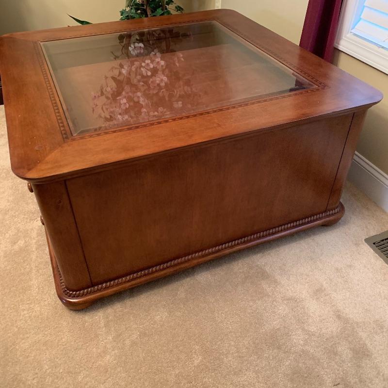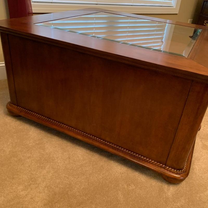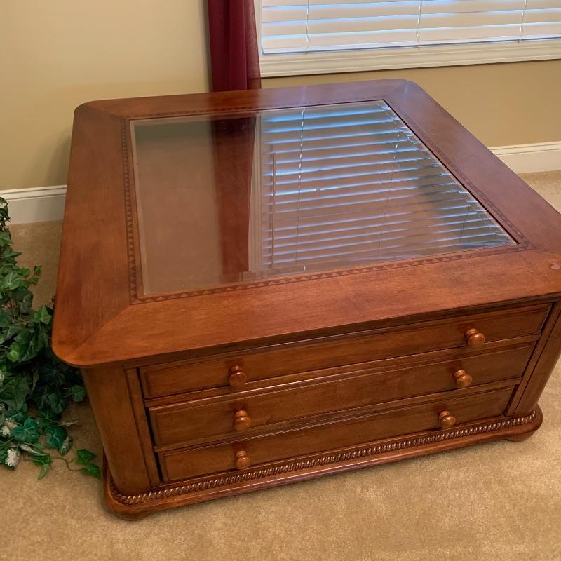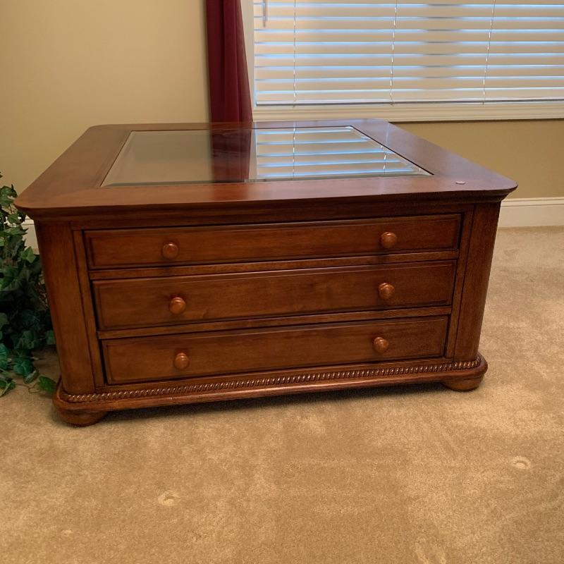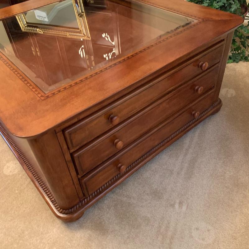 This beautiful and functional piece is great for a formal or informal living space. Three drawers open from two sides with other two sides being smooth. Top drawer is felt lined for displaying items to be seen through top glass. Piece measures 40” x40” x20”. There is a trim around the glass that looks like inlaid but cannot confirm it is actual. See up close photo. Piece is substantial, please bring help to load. Local pick up only.