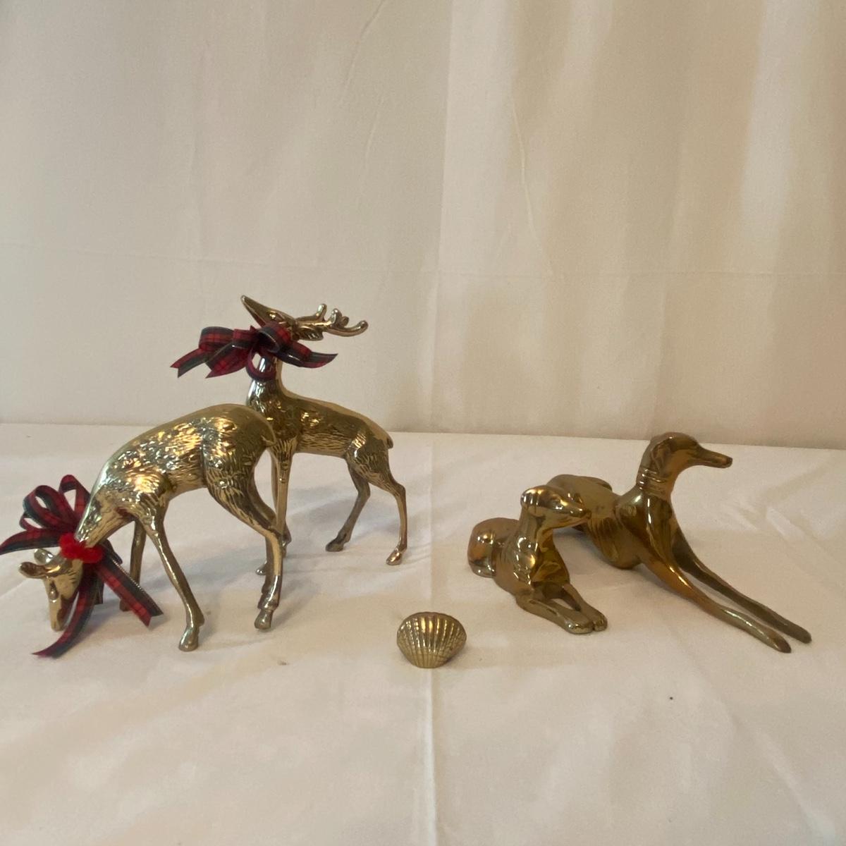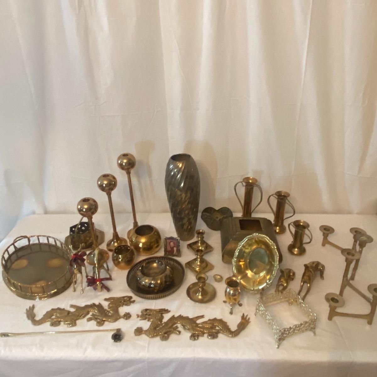 A beautiful brass collection with twenty-eight eclectic items! Brass items range from lighting sources to wall decor, see photos for further inventory and detail. Tall vase stands 13.5" tall. Plate stand not included. Local pickup only.
