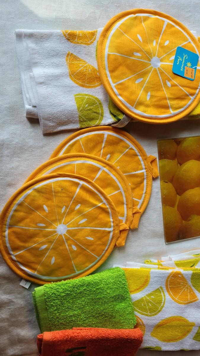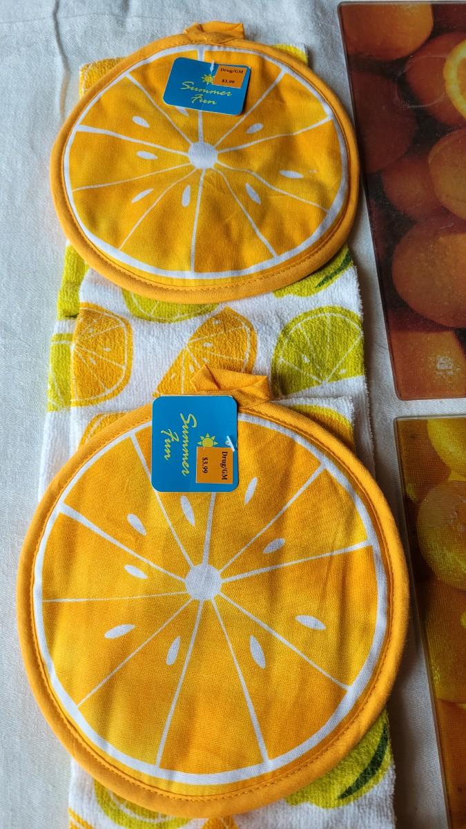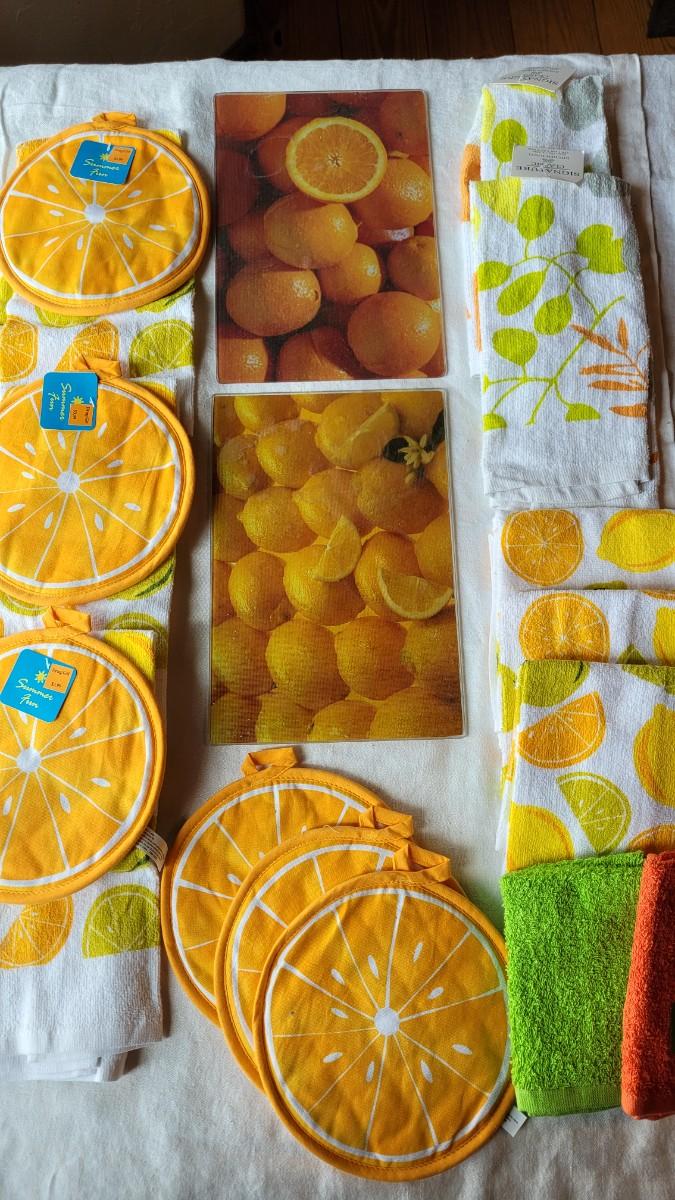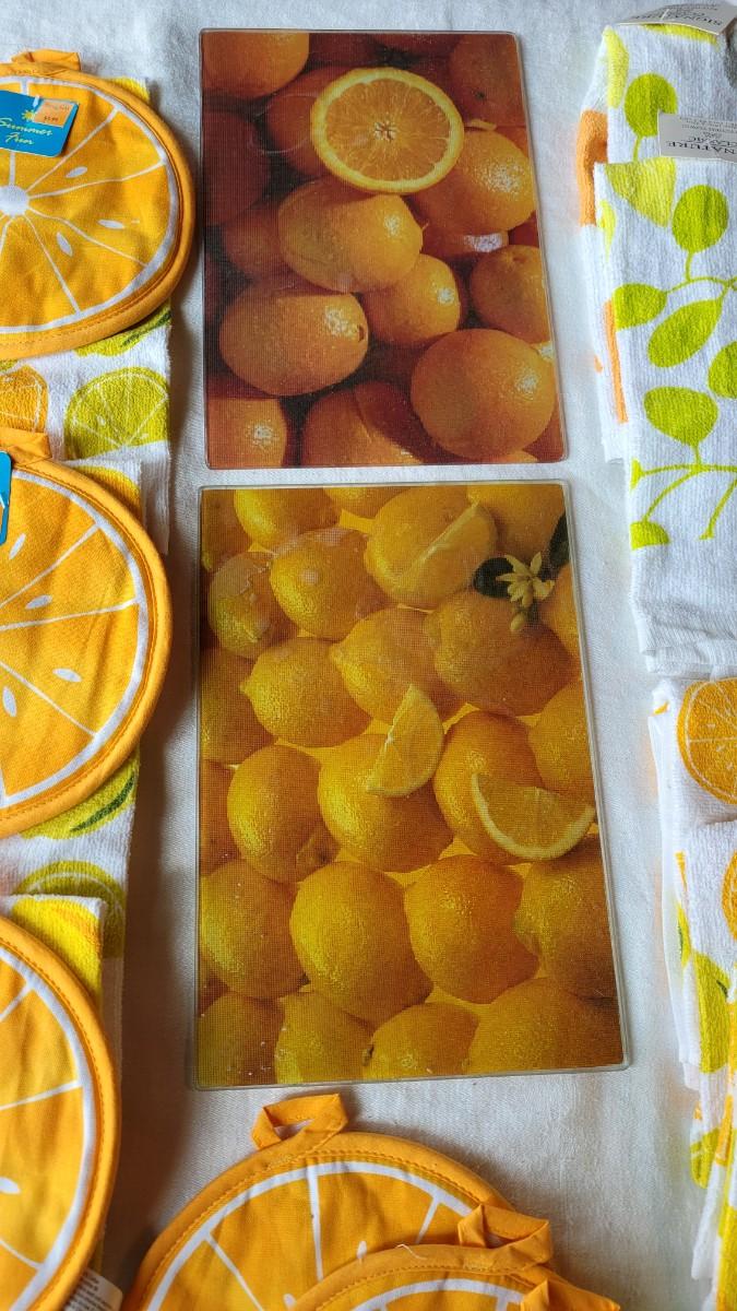 Lot 30: (2) Citrus Glass Cutting Boards & Citrus Pot Holders and Kitchen Towels