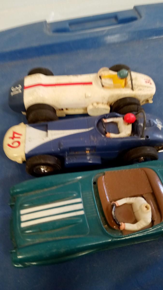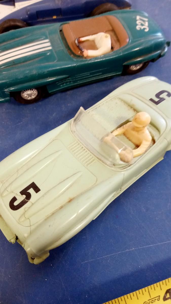 ONE CAR #5 IS CRACKED IN FRONT AND MISSING ONE HEADLIGHT , CAR 327 MISSING HEAD OF DRIVER BUT REST OF CAR IN GOOD SHAPE OTHER TWO CARS GOOD