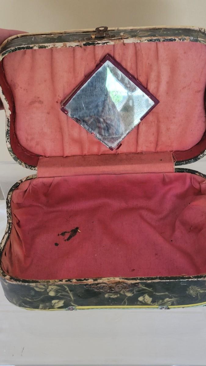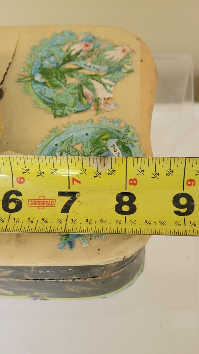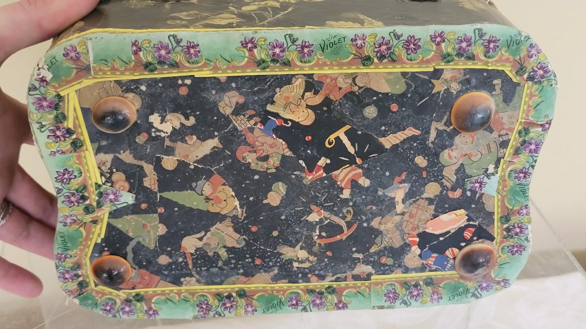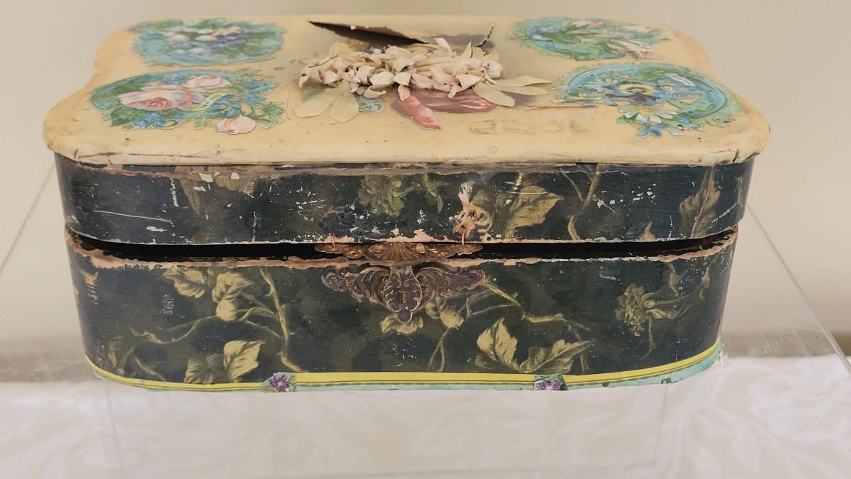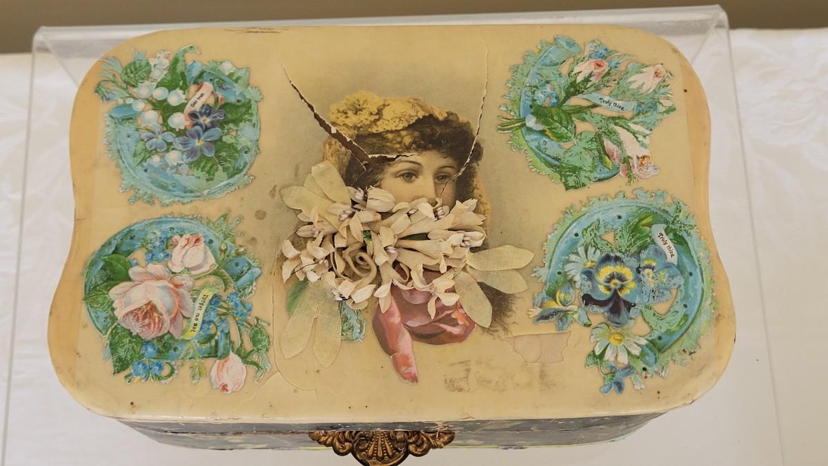 Victorian Trinket Box has been collage what appears to be a very long time ago. The metal box is marked on bottom but it is not legible.