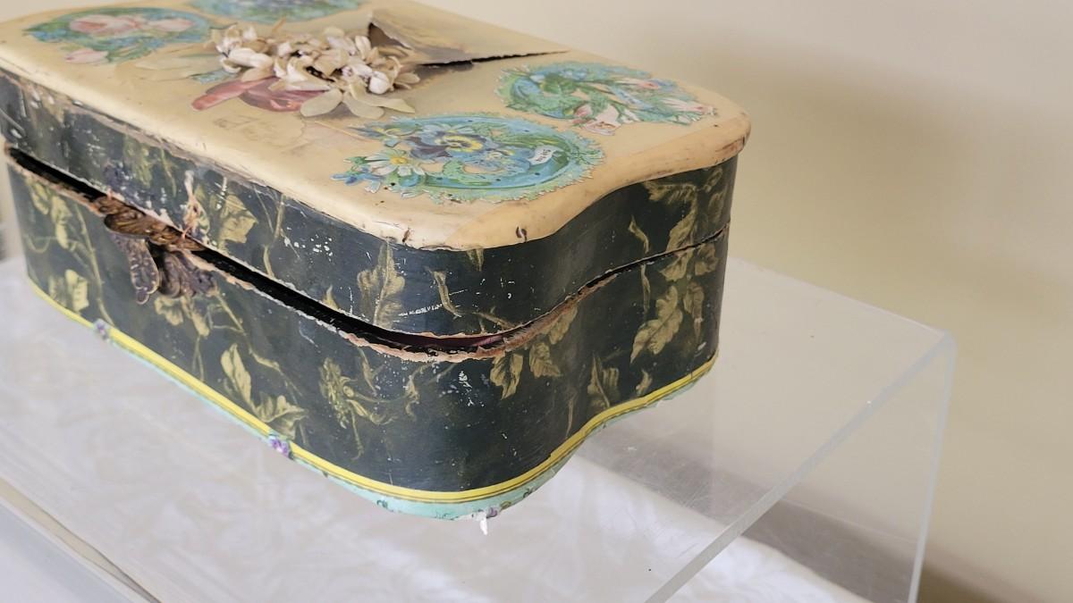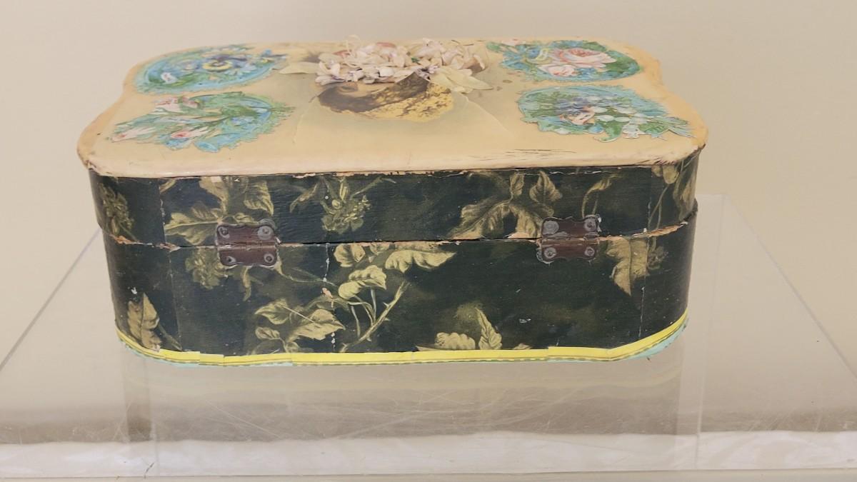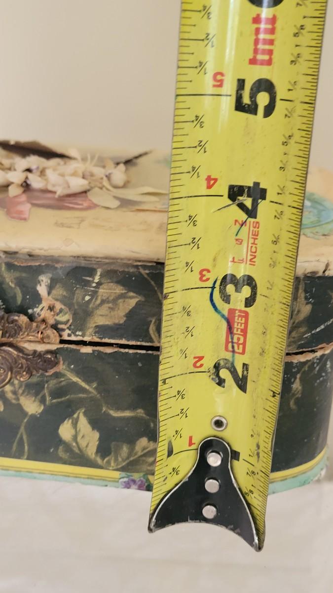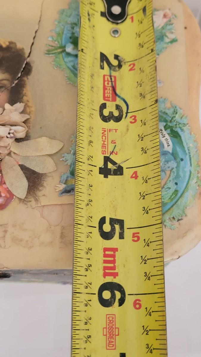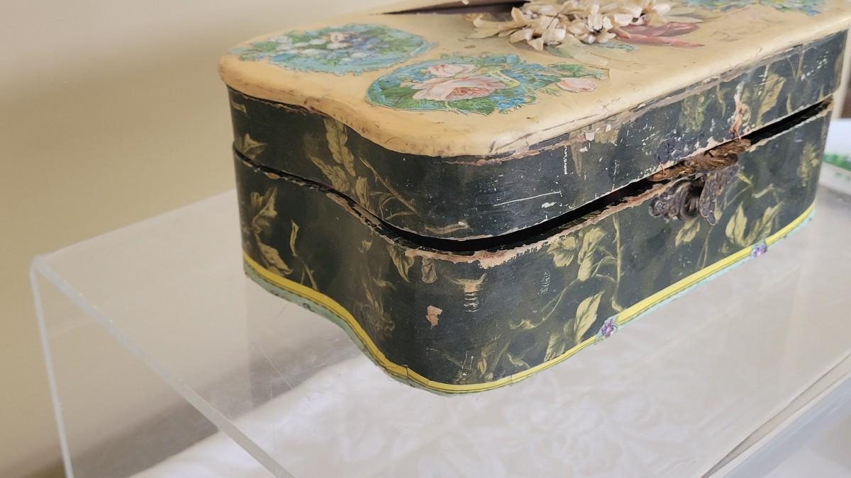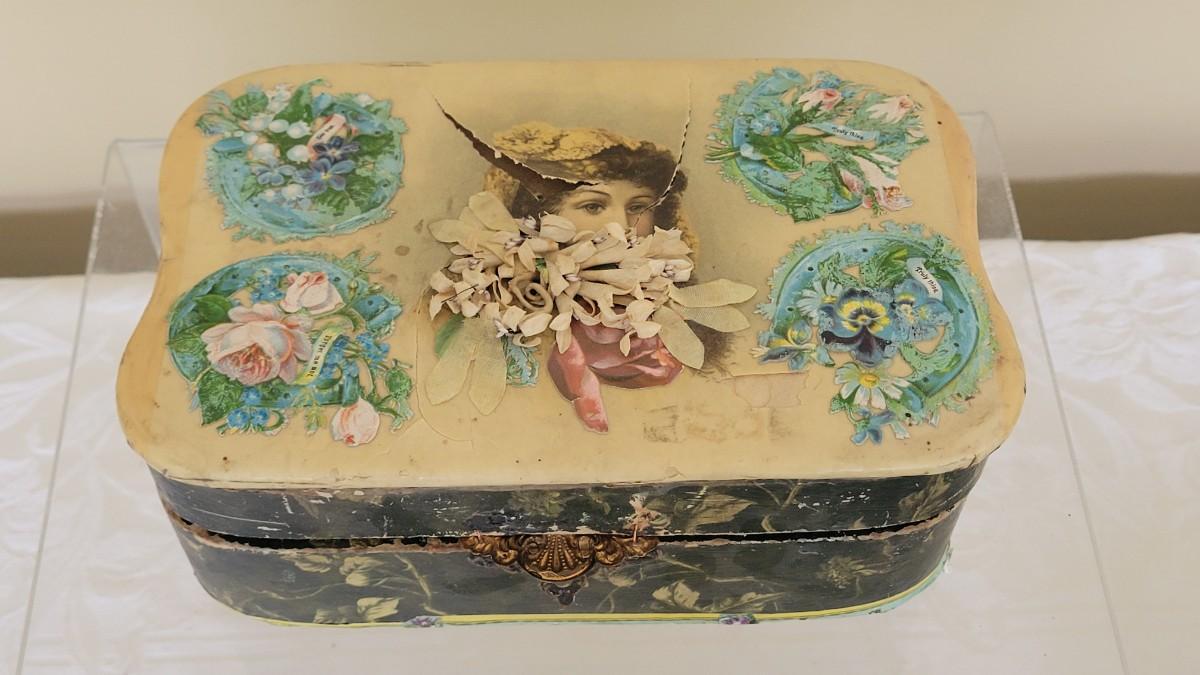 Victorian Trinket Box has been collage what appears to be a very long time ago. The metal box is marked on bottom but it is not legible.