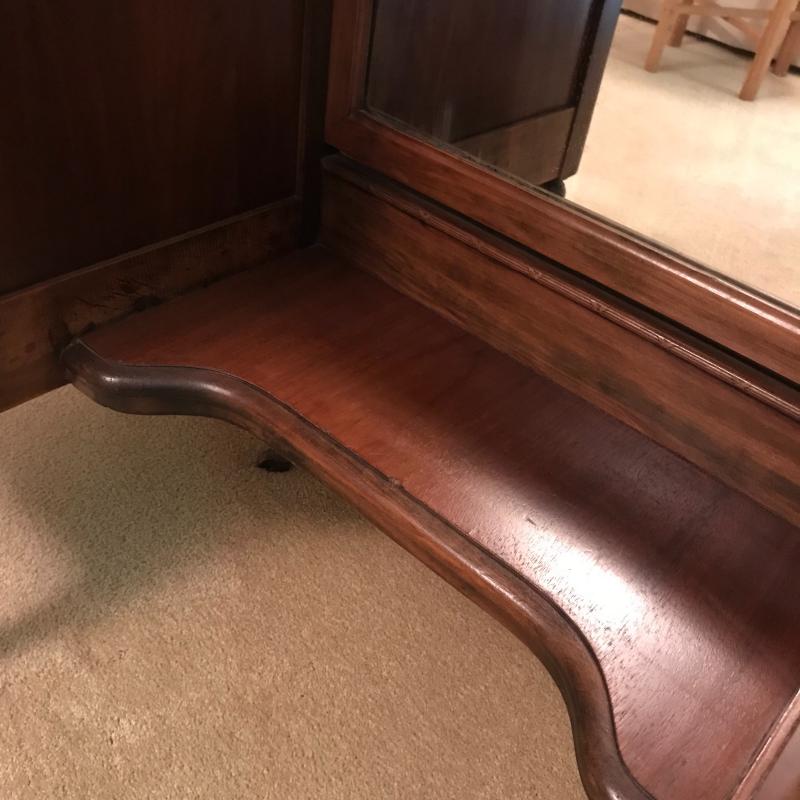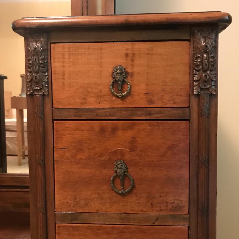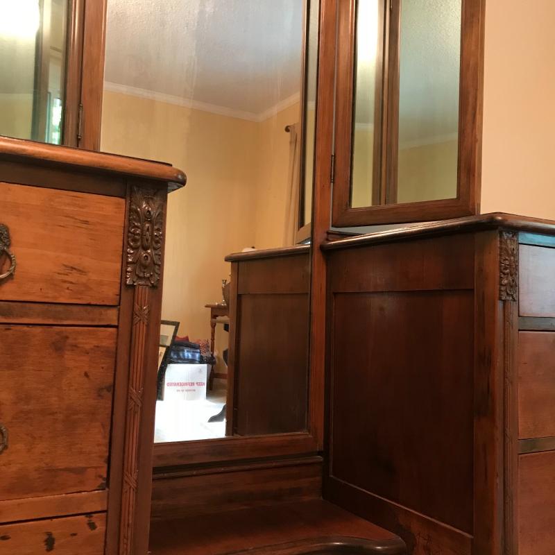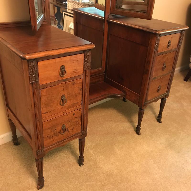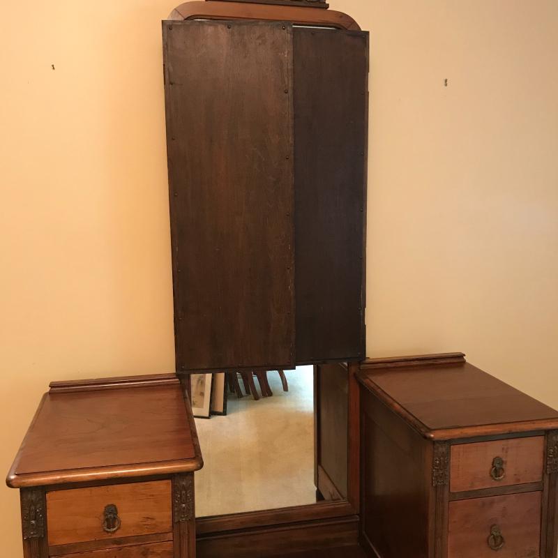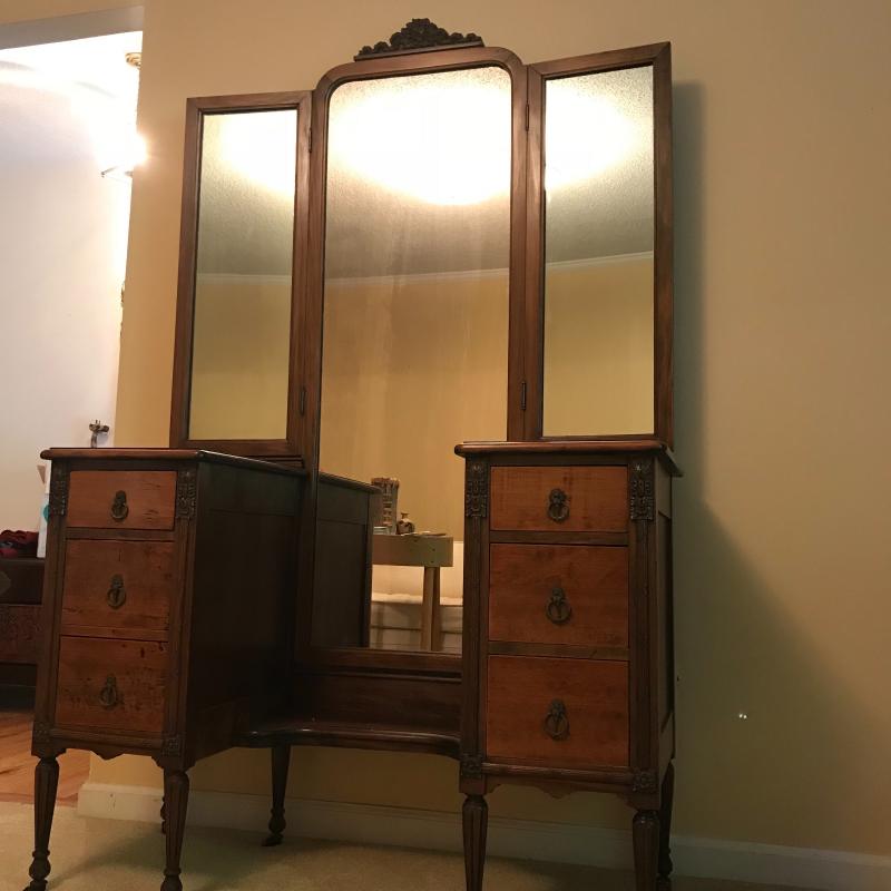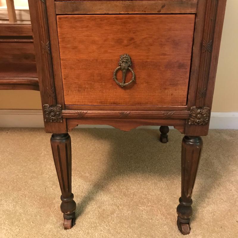 This is a handsome antique vanity on eight casters with carved corners and brass hardware. It is a show stopper that will upgrade your bedroom. Includes attached full size mirror with two folding side mirrors to catch every angle. Carved details on edges. It also has 6 dovetail drawers and shows very little wear. Measures 46”x19”x73.5” Local pick up only. Please bring help to load this heavy piece.