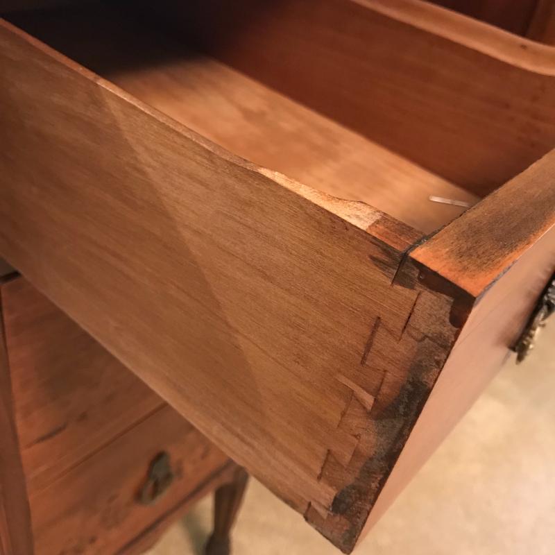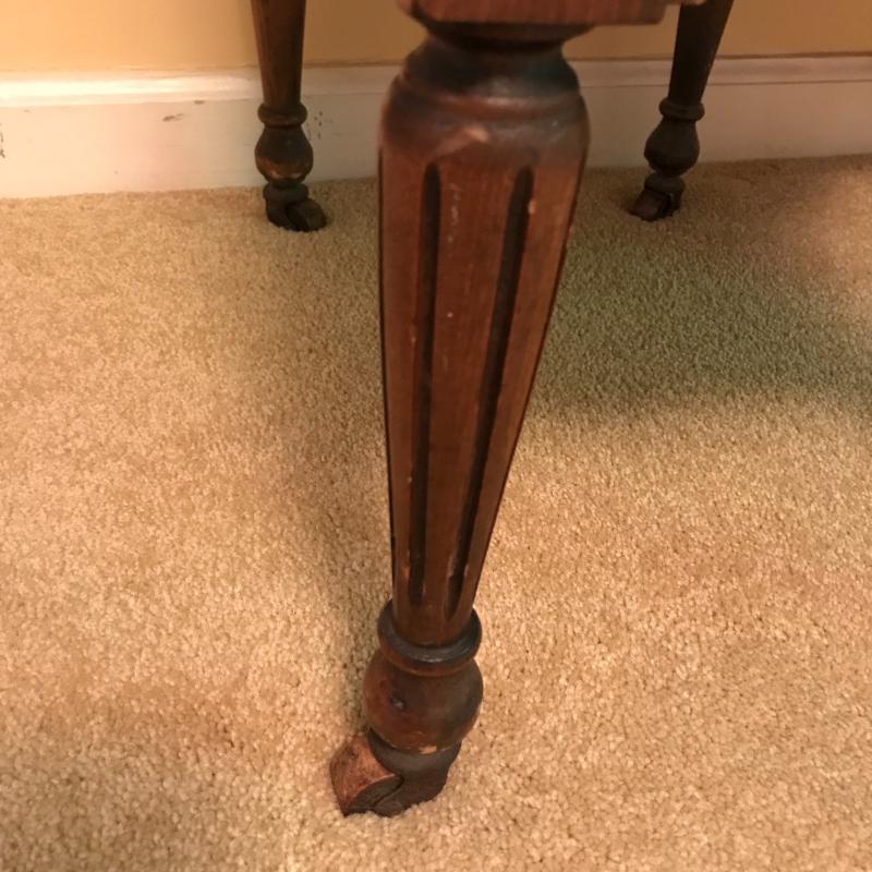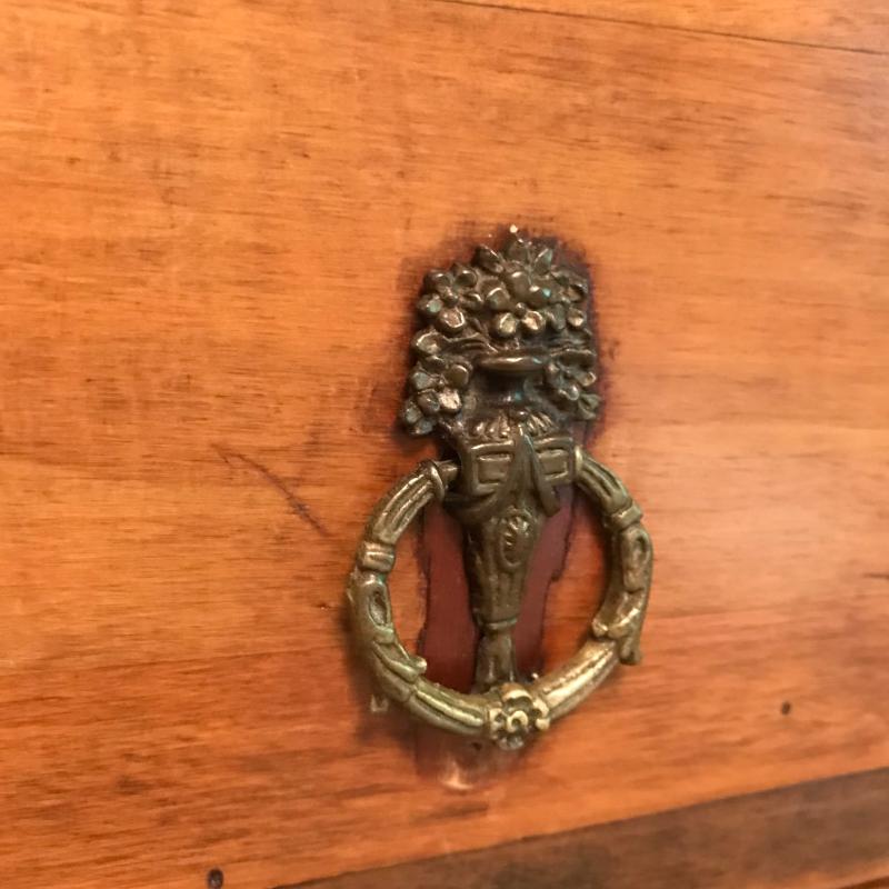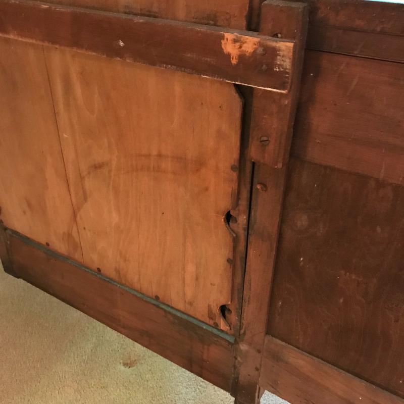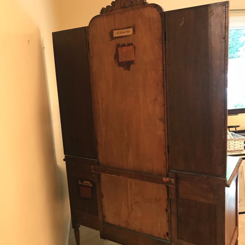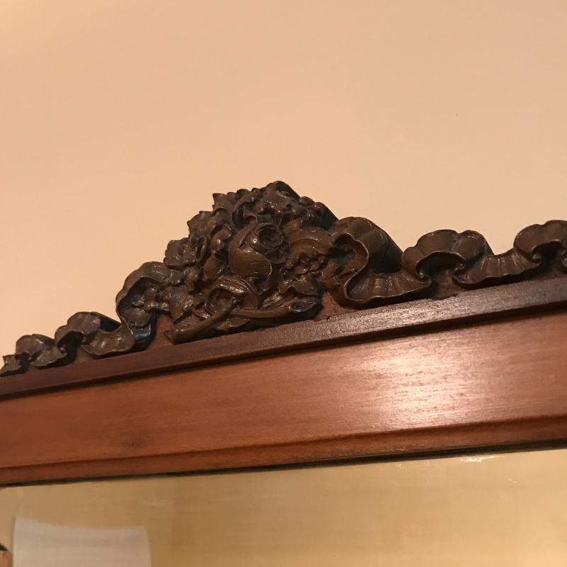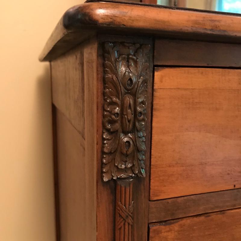 This is a handsome antique vanity on eight casters with carved corners and brass hardware. It is a show stopper that will upgrade your bedroom. Includes attached full size mirror with two folding side mirrors to catch every angle. Carved details on edges. It also has 6 dovetail drawers and shows very little wear. Measures 46”x19”x73.5” Local pick up only. Please bring help to load this heavy piece.