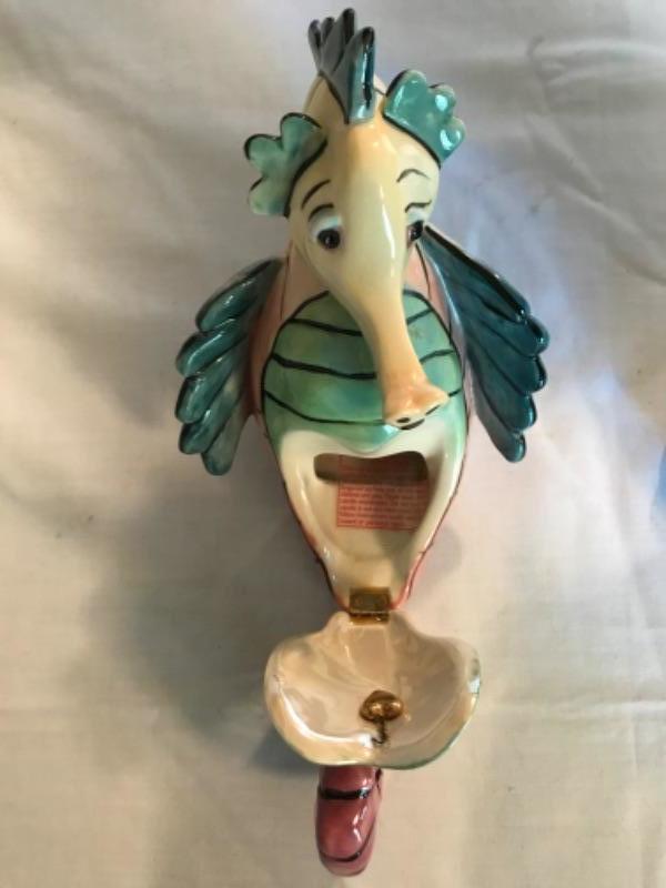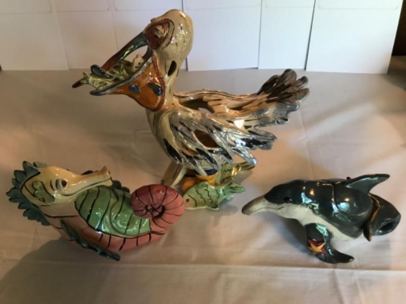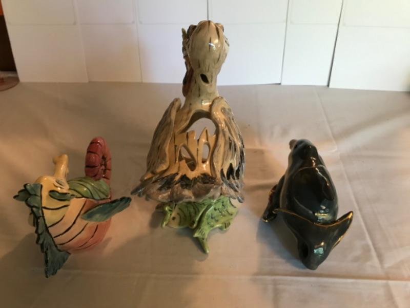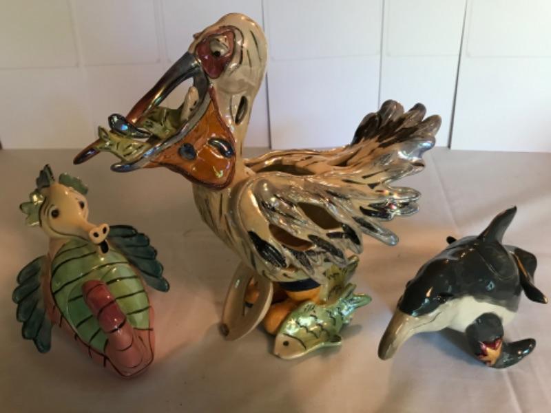 Pelican measures 9-1/2” tall and 10-1/4” from beak to tail, does need magnet glued back in place to hold candle door closed. Seahorse measures 5-1/2” tall and 7-3/4” long. Dolphin measures 4” tall and 7” long . All pieces are signed Heather Goldminc