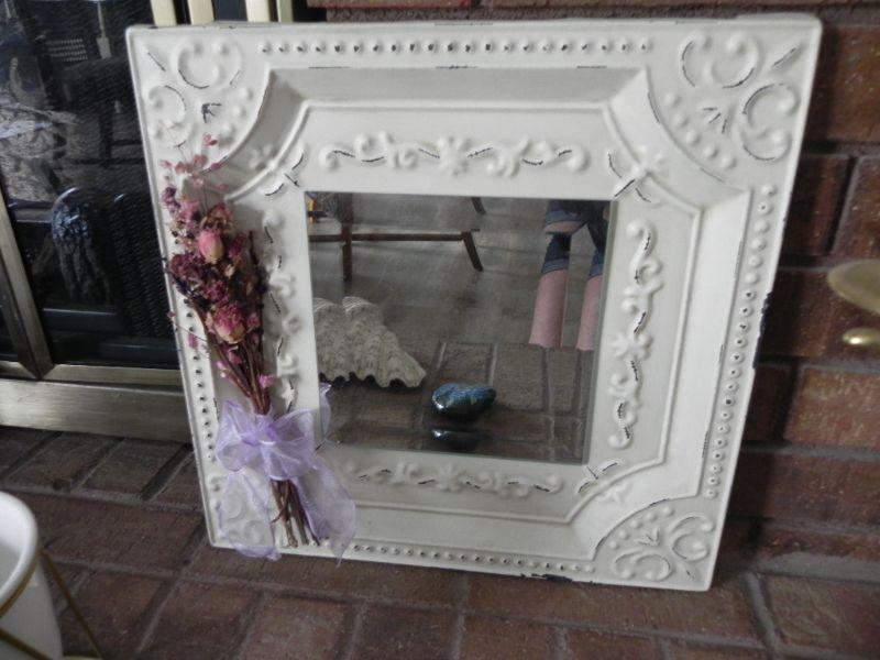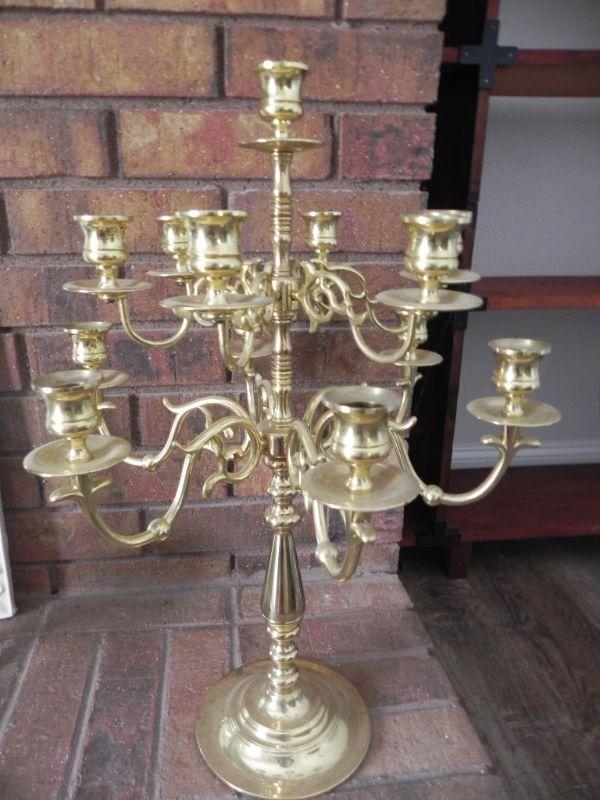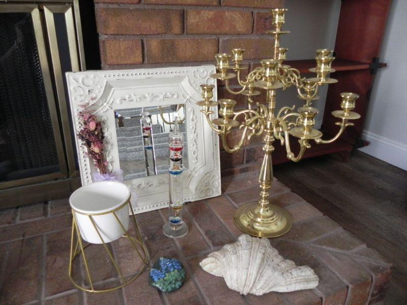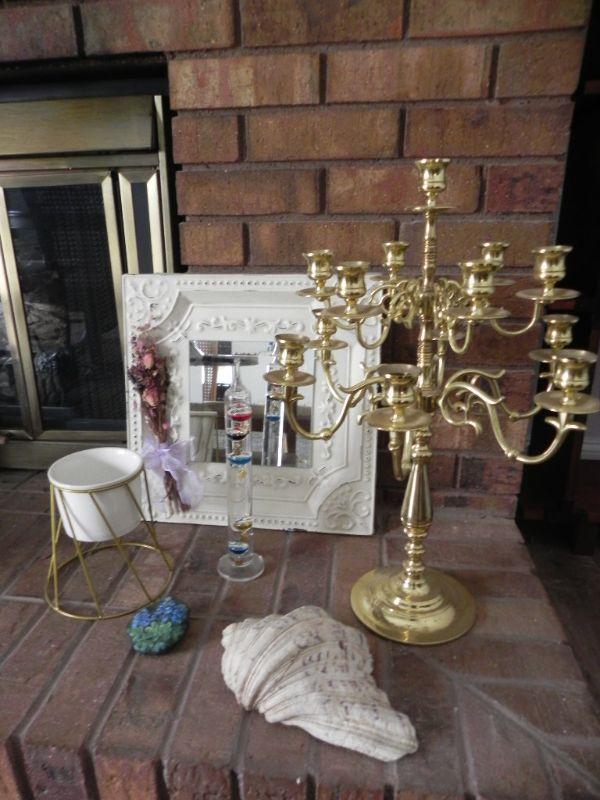 GLASS THERMOMETER, BRASS CANDELABRA HOLDS 13 CANDLES, WHITE PAINTED FRAMED MIRROR AND MORE