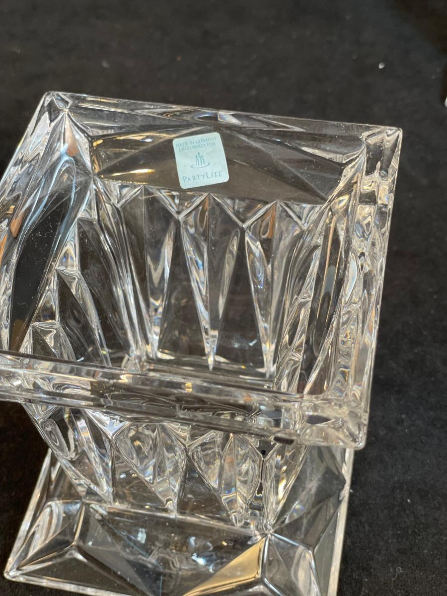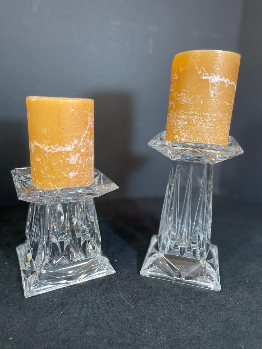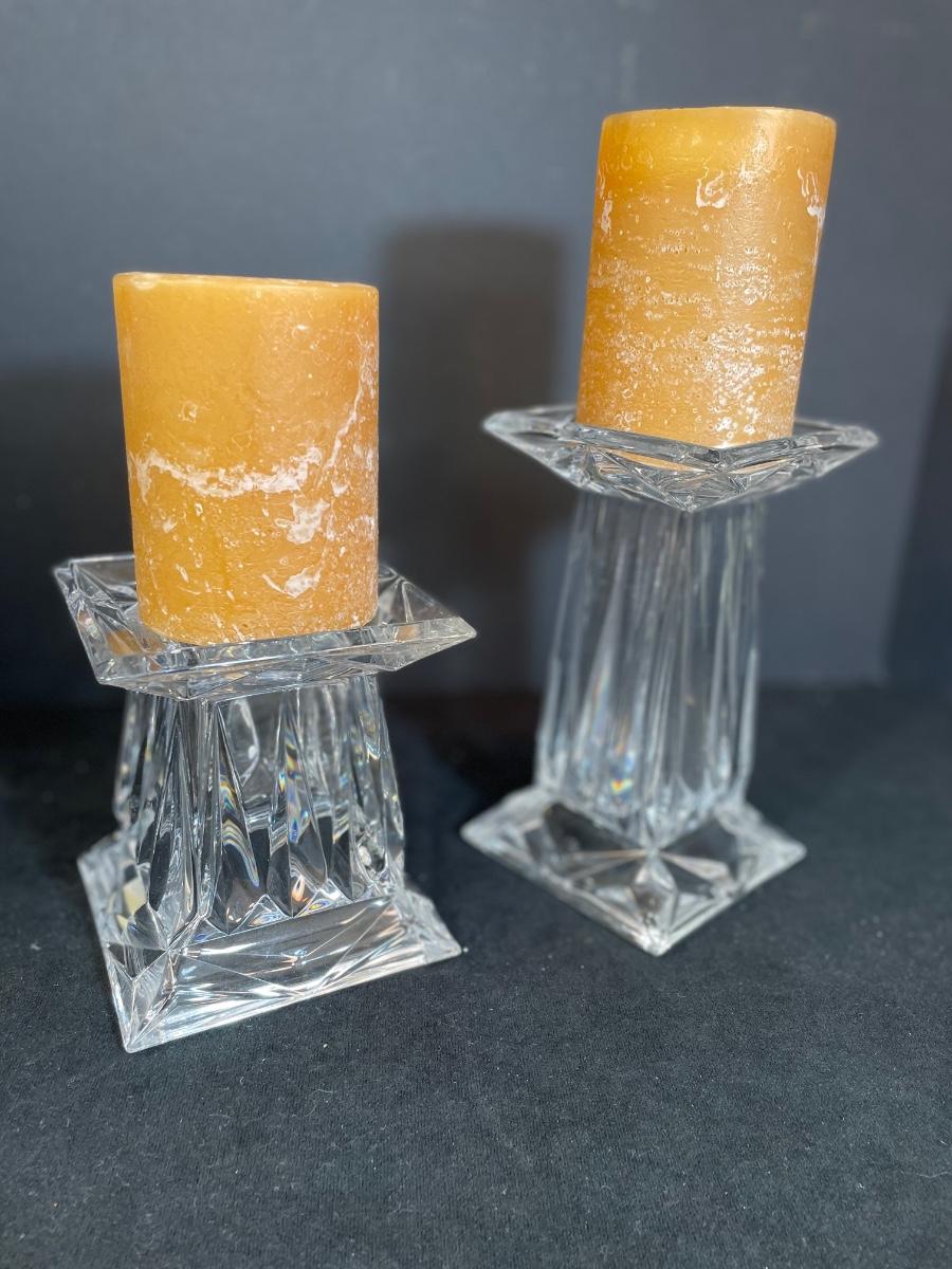 2 Glass Pillar candle holders with candles. Candle holders made in Germany exclusively for Partylite.