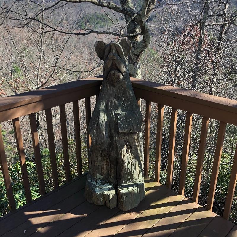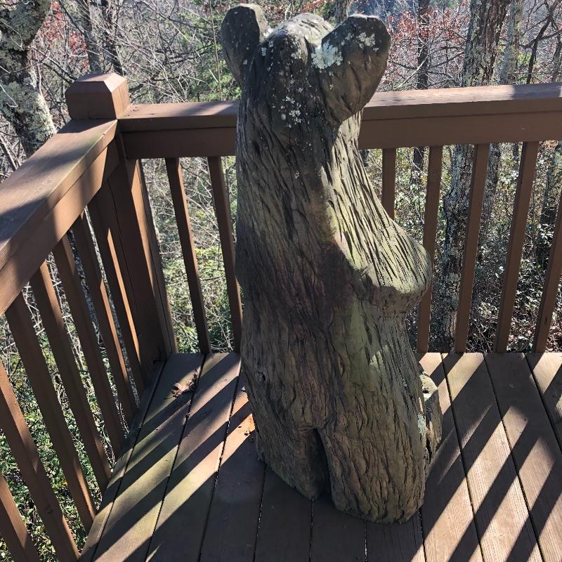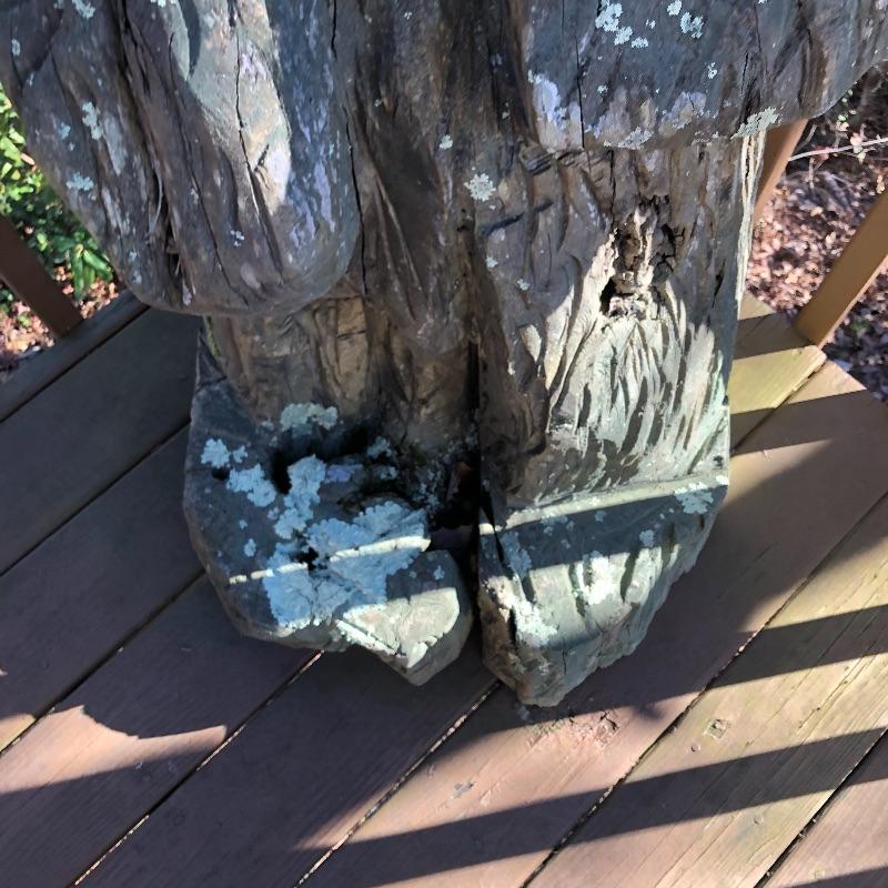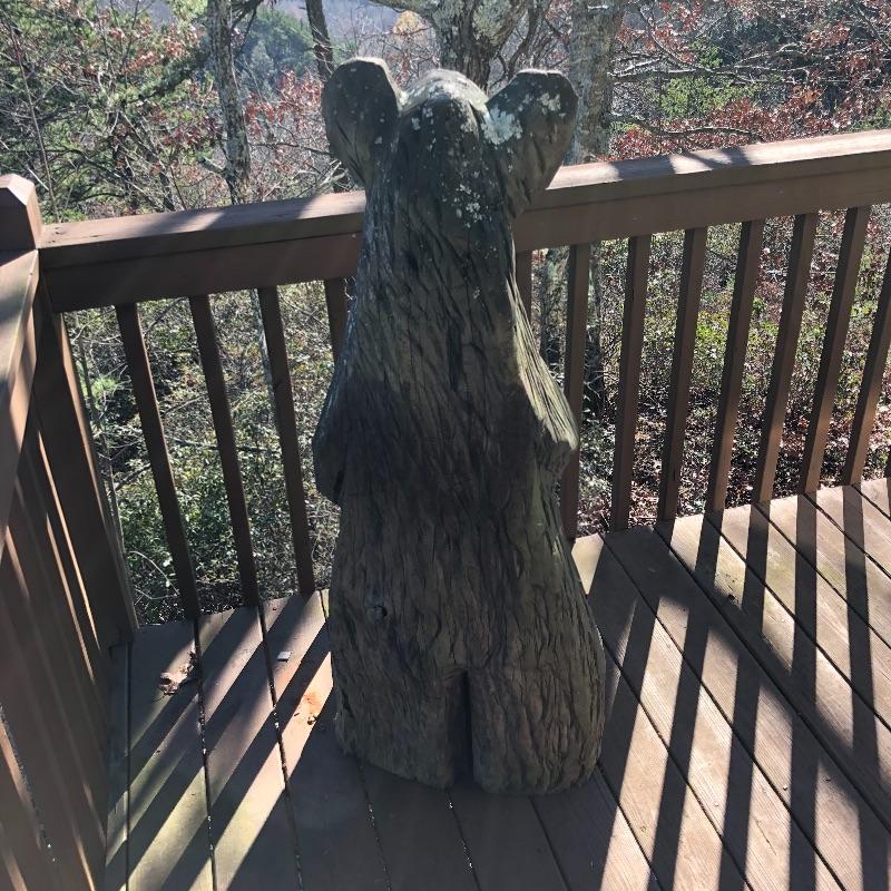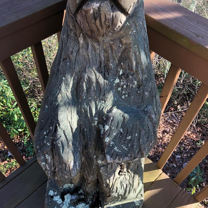 This carved bear will look great on your deck or porch. Bear has lichen in a few spots, see pictures. Bear appears to be carved with a chainsaw. Bear measures 20” x 22” x 50.5”. Bring help item is substantial
