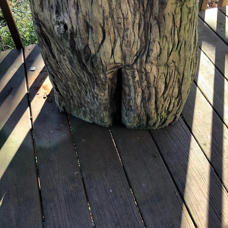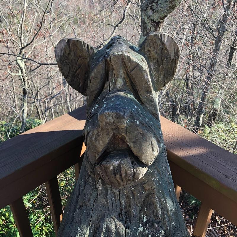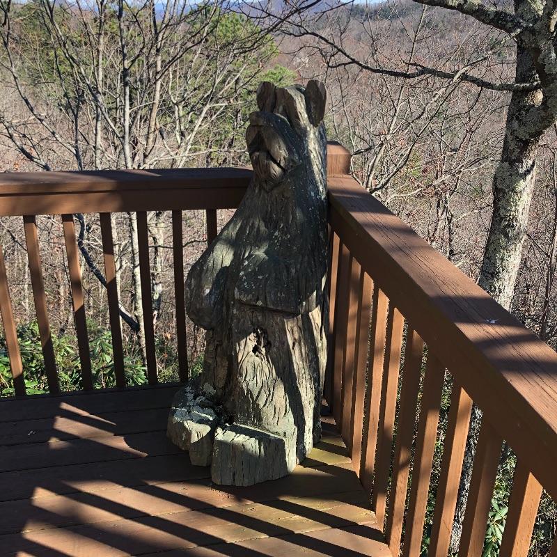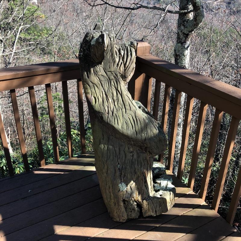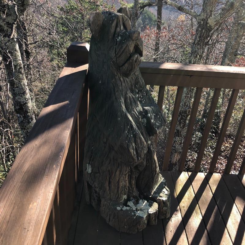 This carved bear will look great on your deck or porch. Bear has lichen in a few spots, see pictures. Bear appears to be carved with a chainsaw. Bear measures 20” x 22” x 50.5”. Bring help item is substantial