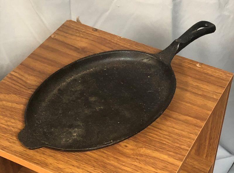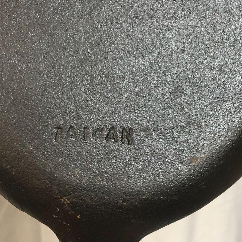 This pan was made in Taiwan and appears to just need to be cleaned and re-seasoned. It is 15.25" from end to end.