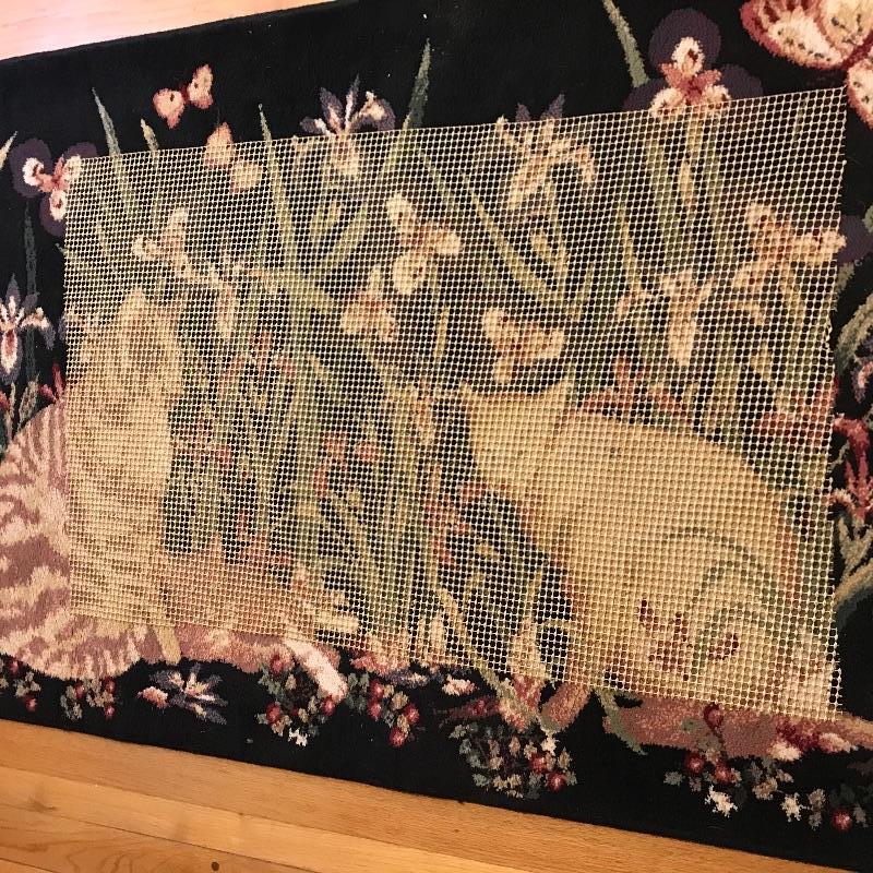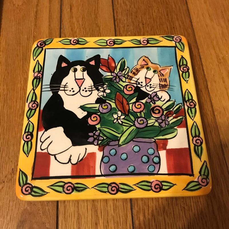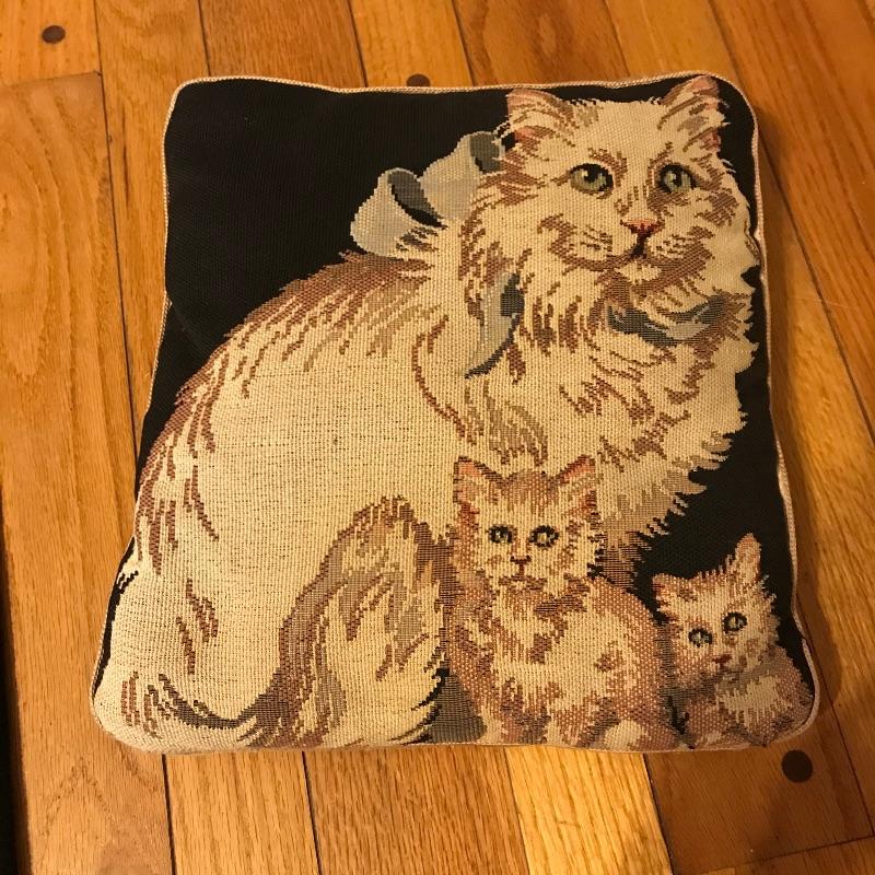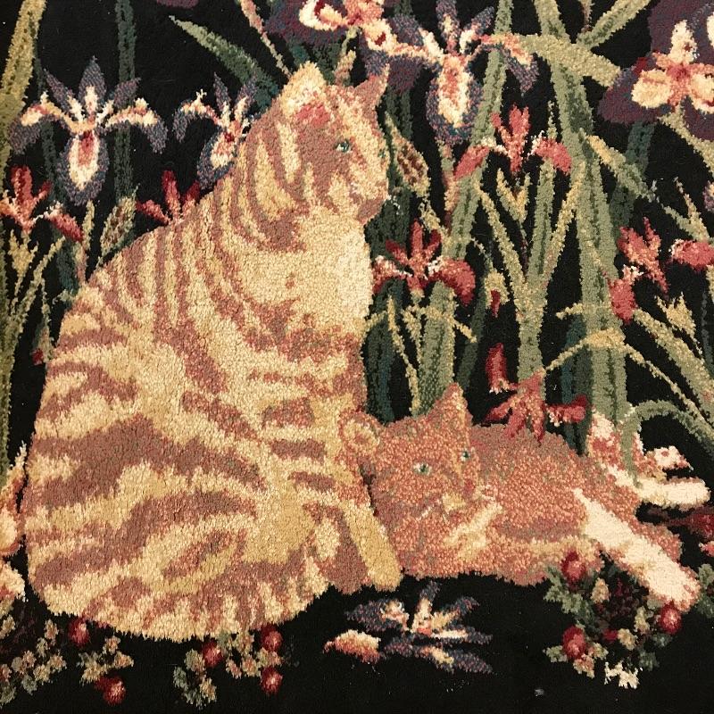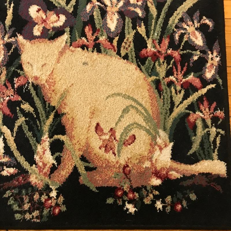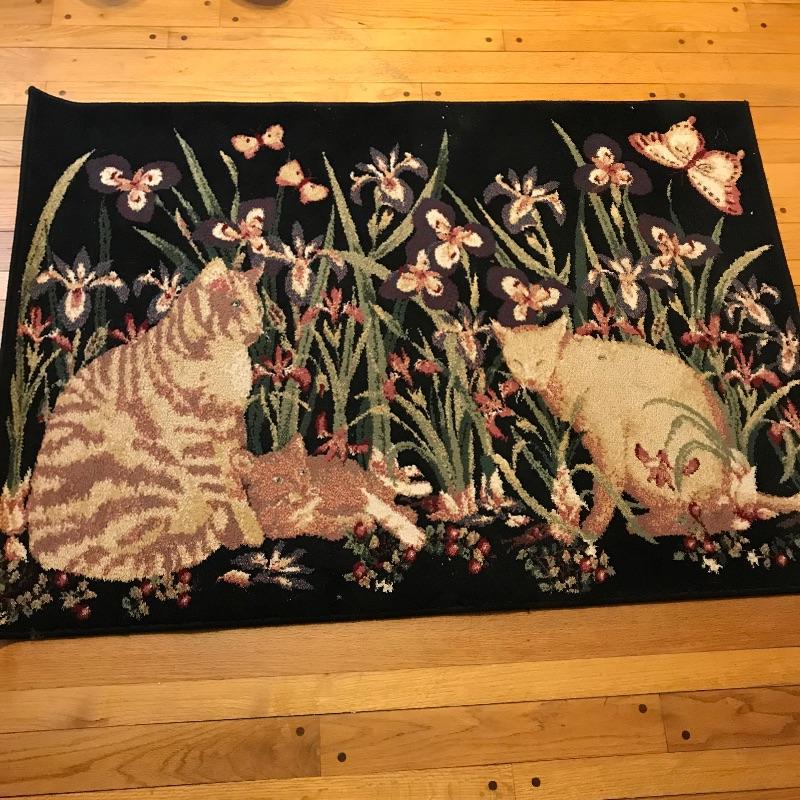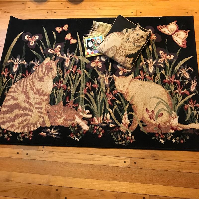 Cute collection of furry friends to bring a smile to your face! A nice small area rug measuring approximately 40” x 56.5”. Rug needs a little cleaning, see images, but it’s in great shape and well worth the personality. We’ve also thrown in a small non slip mat, decorative Catzilla trivet and small throw pillow. See photos. Local pick up only.
