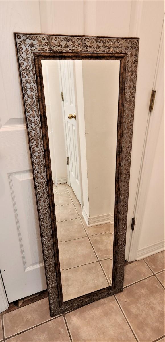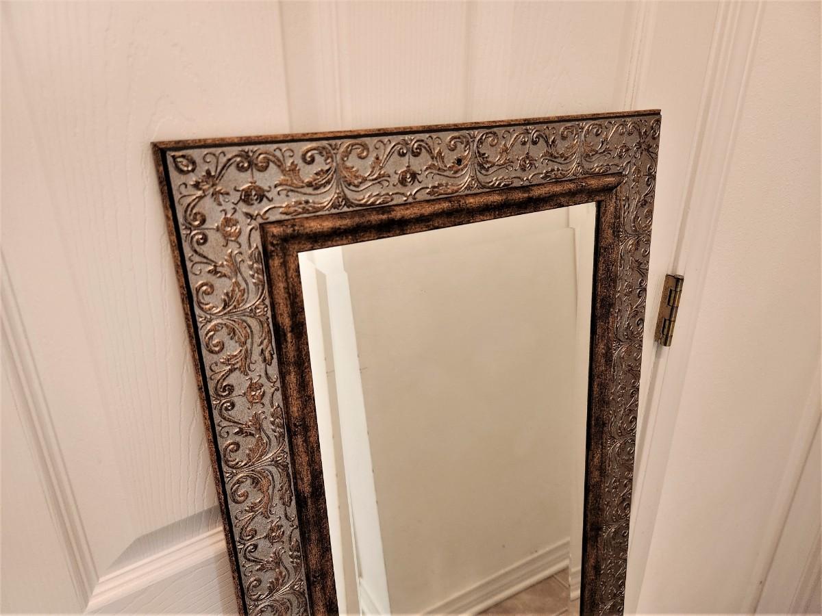 Newish decorative beveled wall mirror - metal frame - good condition. 53" tall, 17" across - silver/gold.