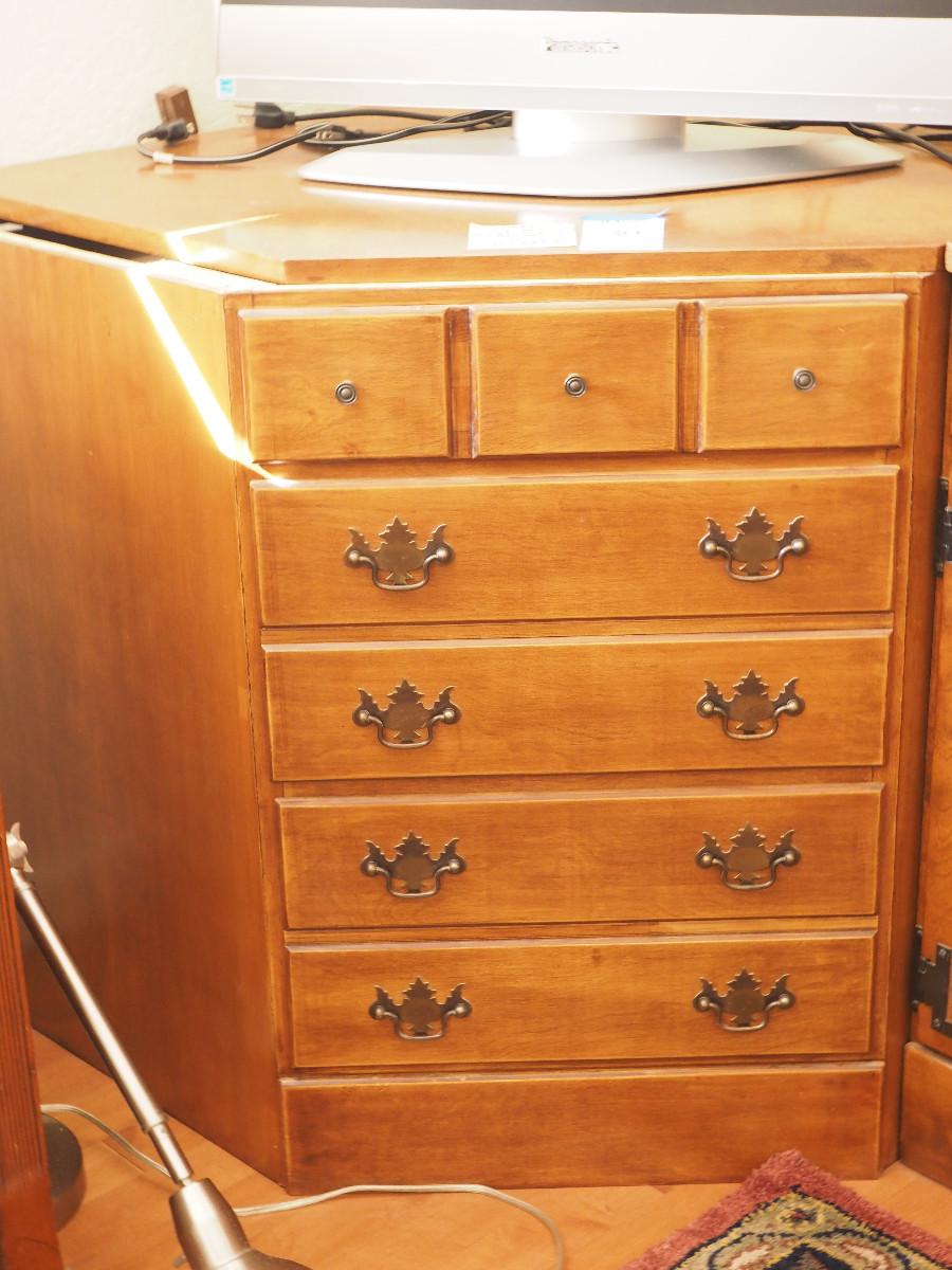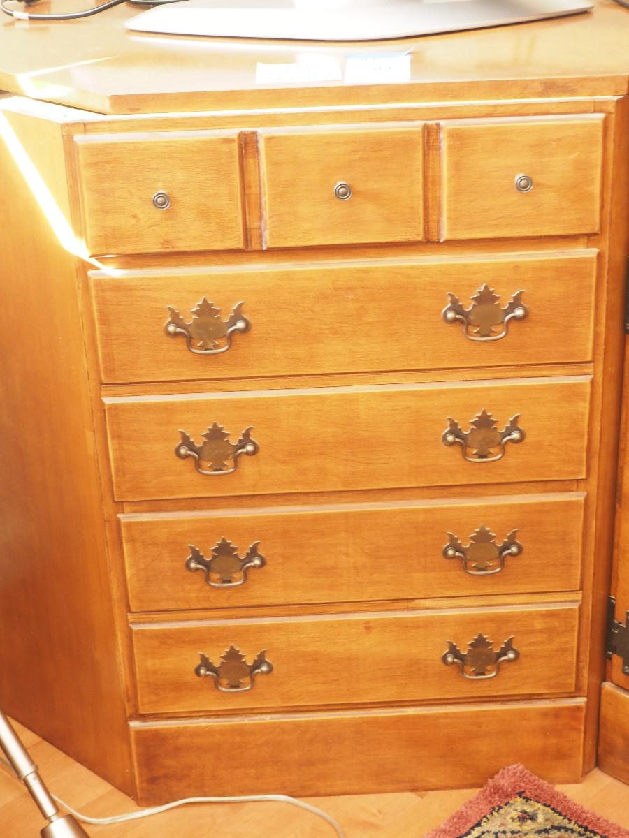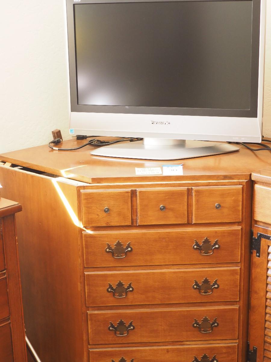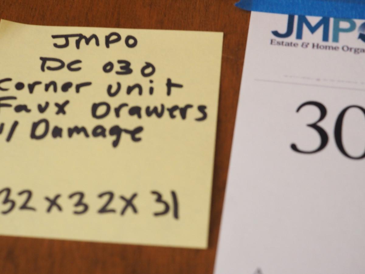 Lot 30 Corner TV stand with faux drawers : 32 X 32 X31 . Top has slide off, unit is hollow inside. Modular piece easy to move.