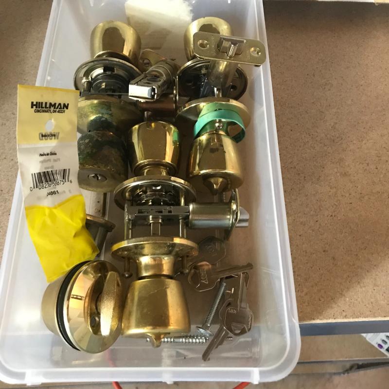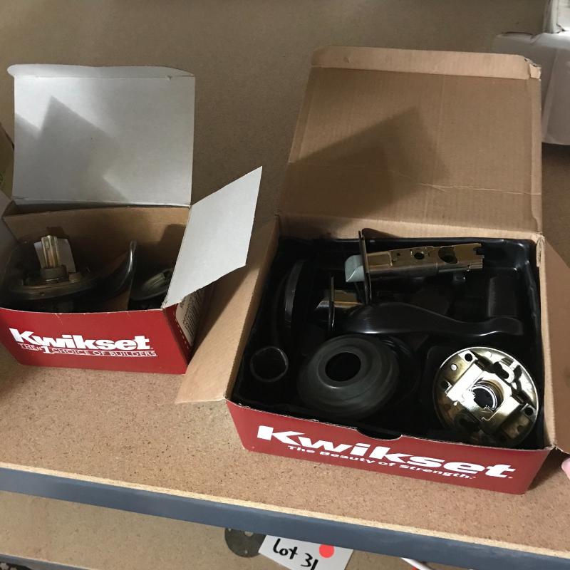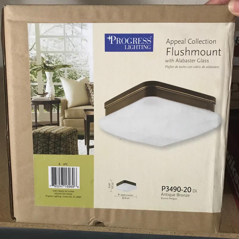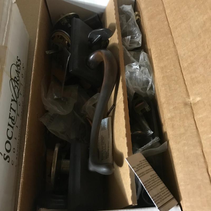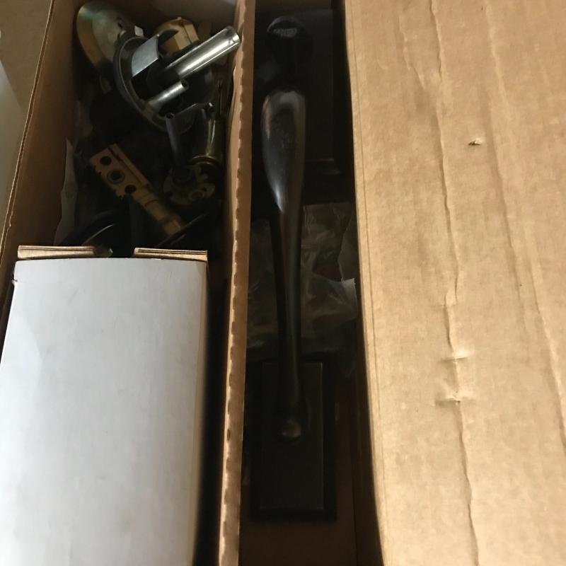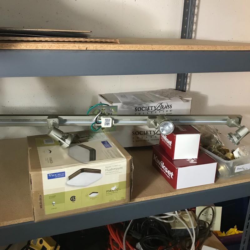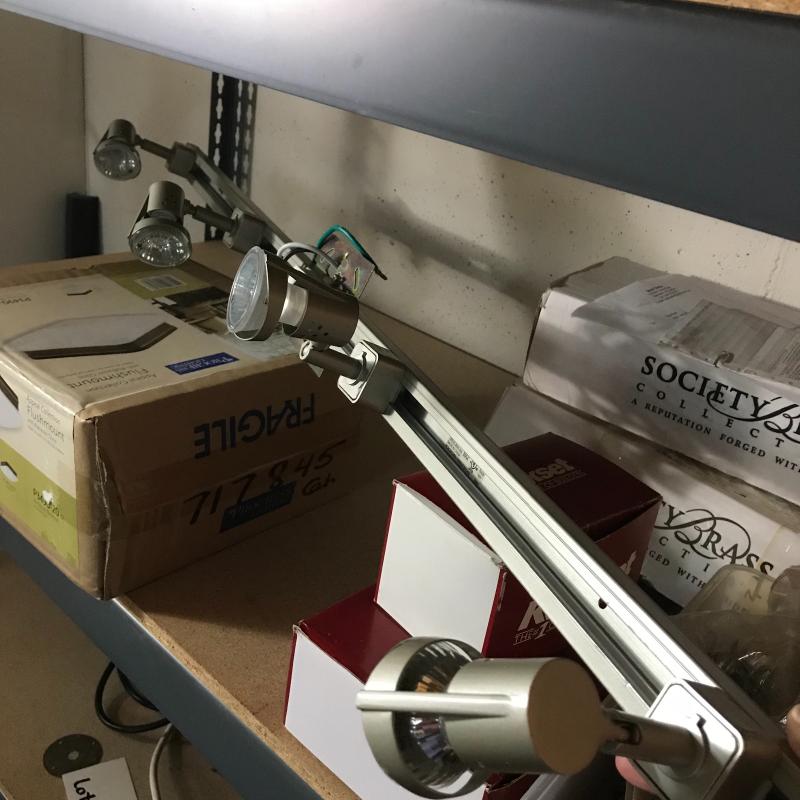 Small track light with 4 bulbs. Entireunit measures 42” long. 3 brass locking door knobs and dead bolt., kwikset bolt and door knob in a gun powder grey, flush mount light still in sealed box by progress light on antique bronze and alabaster glass, 2 society brass exterior door handles. Lot is available for local pick up in Asheville, NC only.