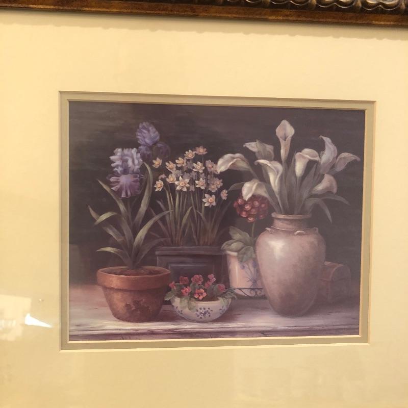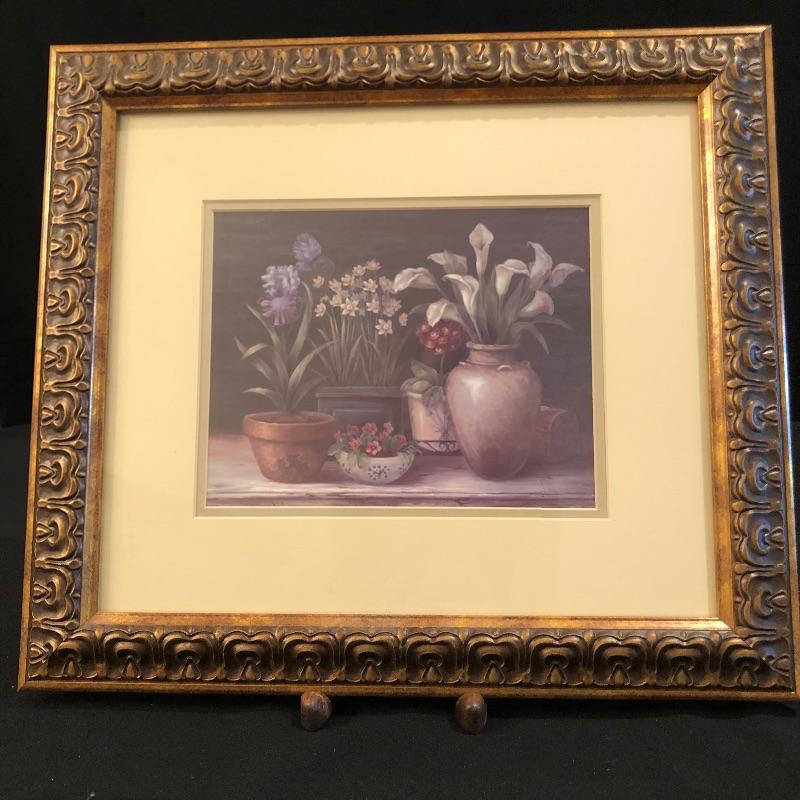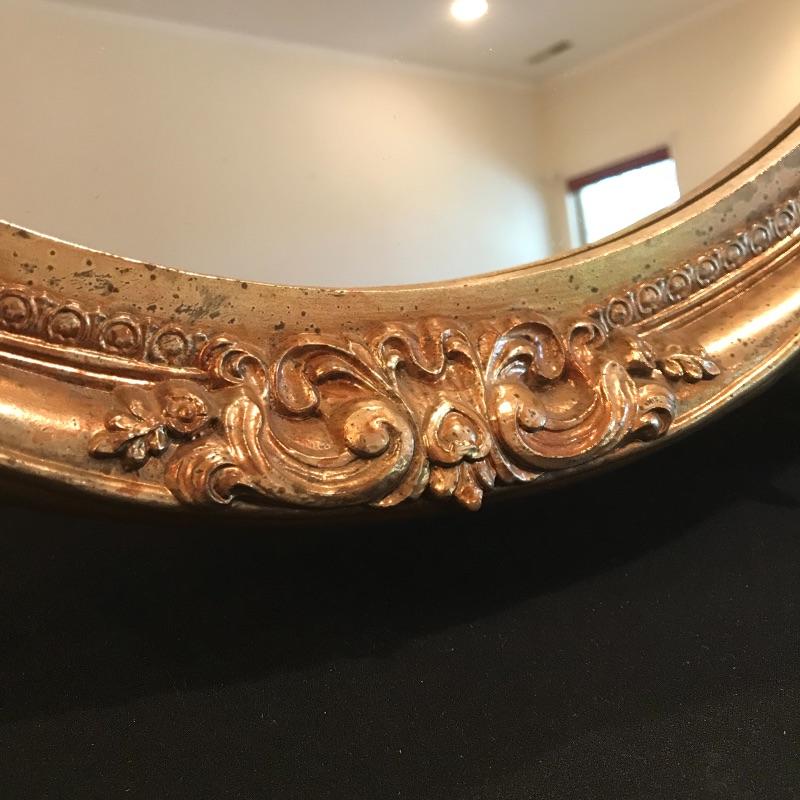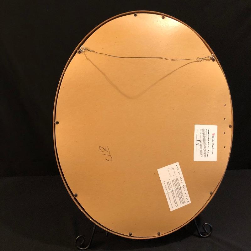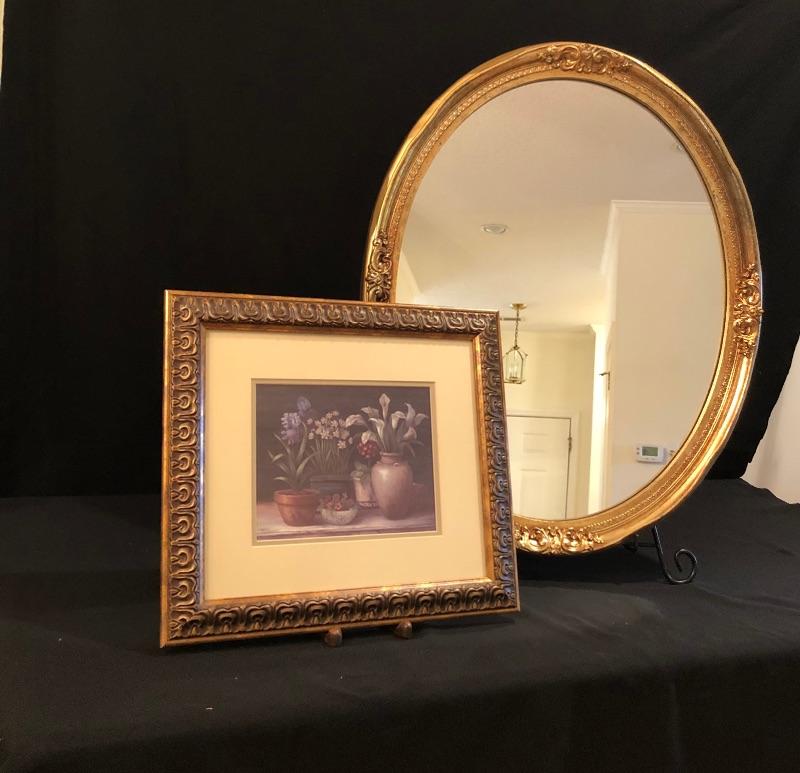 This Ornate gilded mirror is oval shaped and in excellent condition, made by the Carolina Mirror Company, It measures 24” x 30”. We have paired it with a framed print titled “˜Floral Sensation’. The frame is an ornate bronze color with a cream matting.