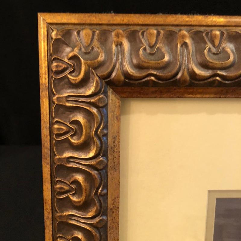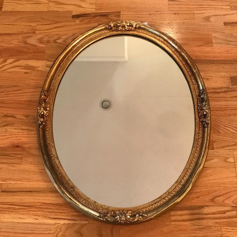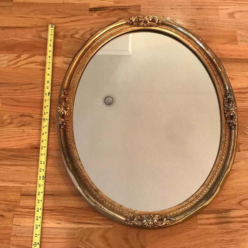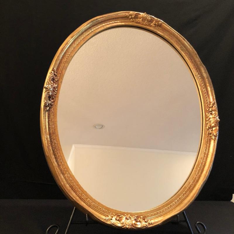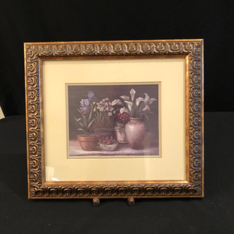 This Ornate gilded mirror is oval shaped and in excellent condition, made by the Carolina Mirror Company, It measures 24” x 30”. We have paired it with a framed print titled “˜Floral Sensation’. The frame is an ornate bronze color with a cream matting.