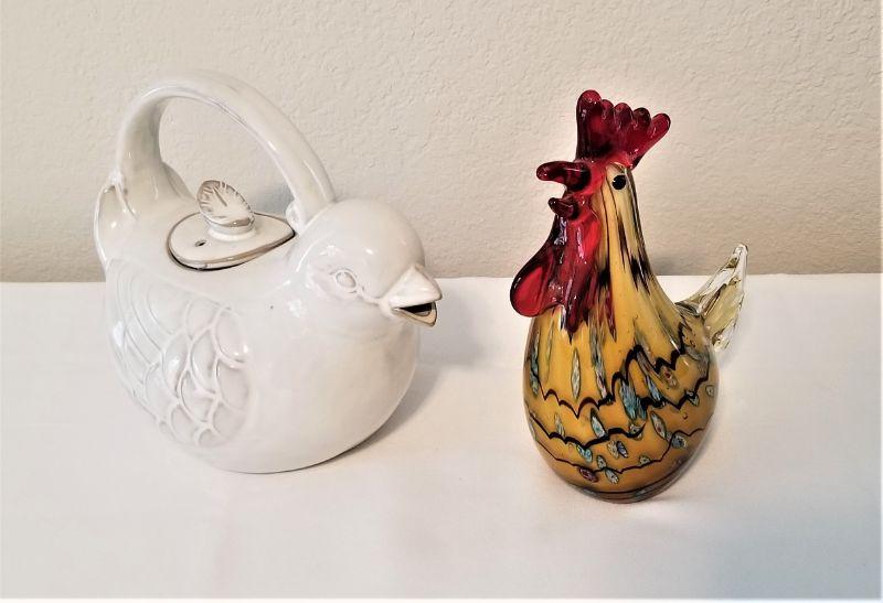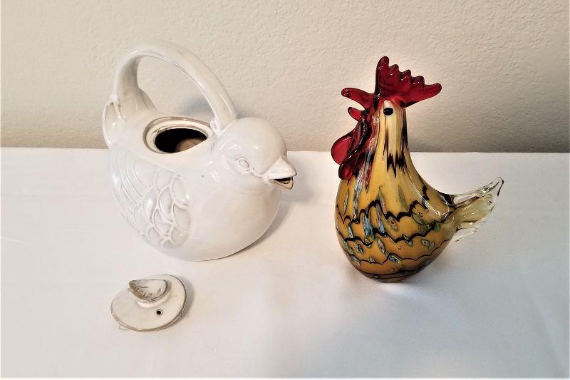 Two pieces of contemporary home decor - figural bird teapot and blown glass rooster. Rooster is 7.5" tall - teapot 9" across. Both in good condition.
