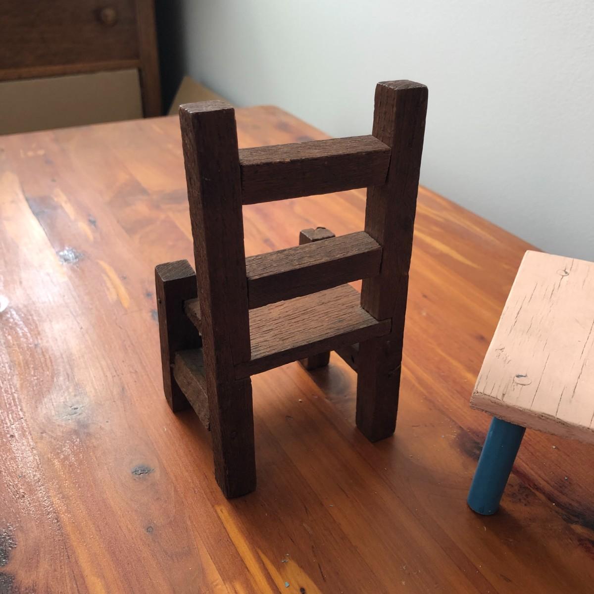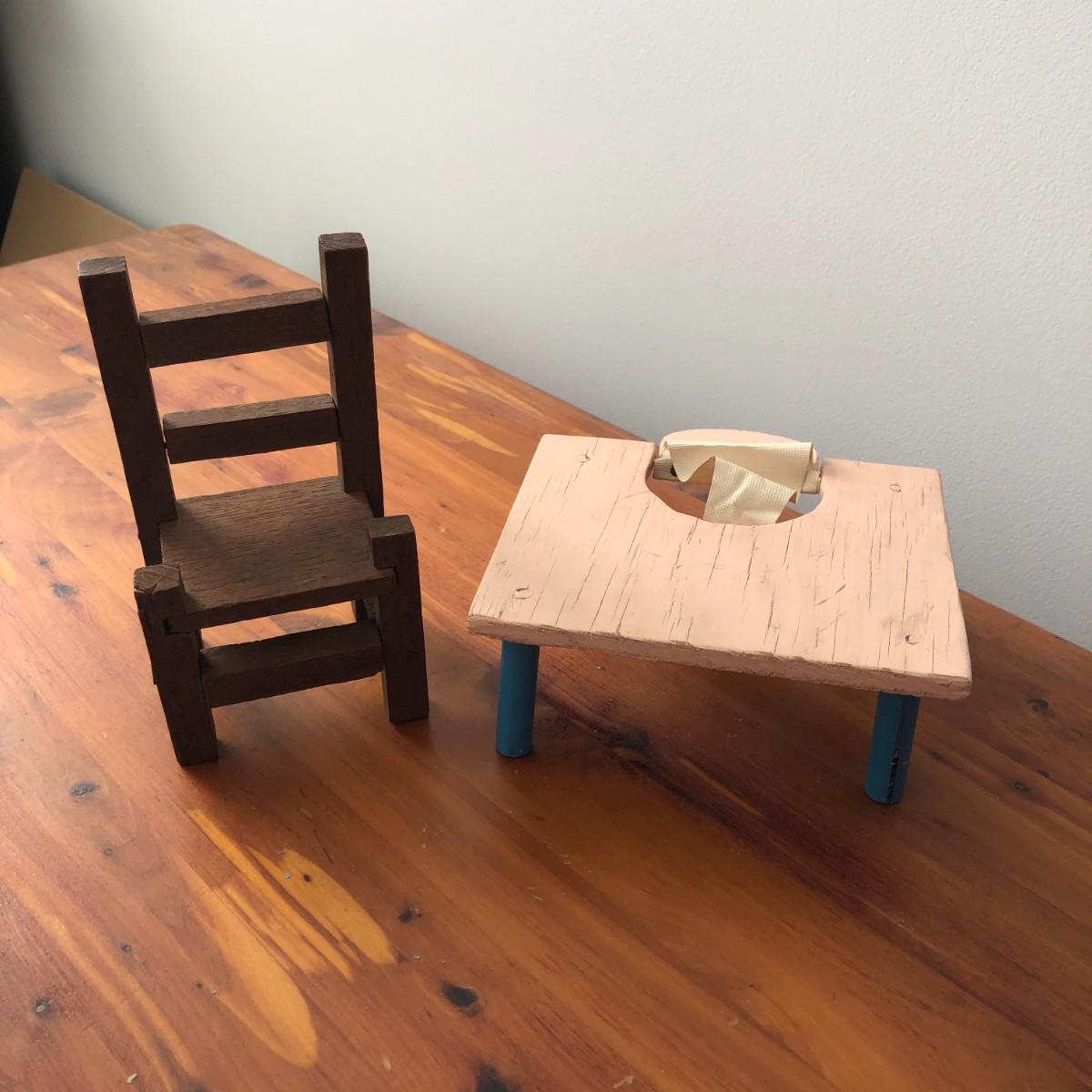 These were made for the consignor when she was a child in the 1950s and are in great condition. The chair is about 6.25" and the table is about 2.5" tall and 6" wide.