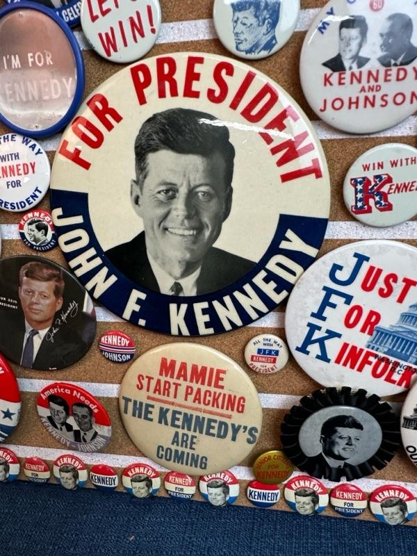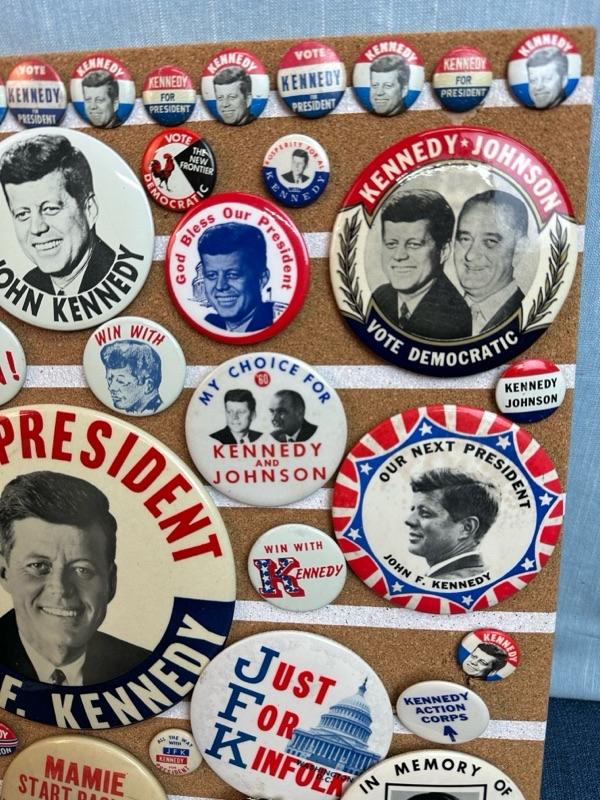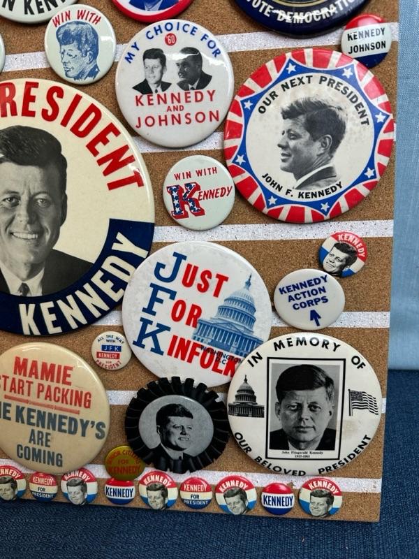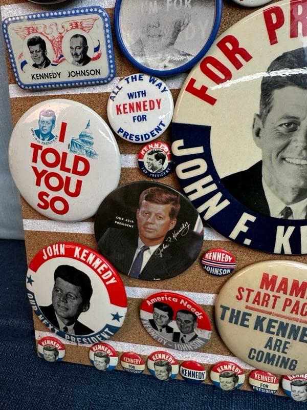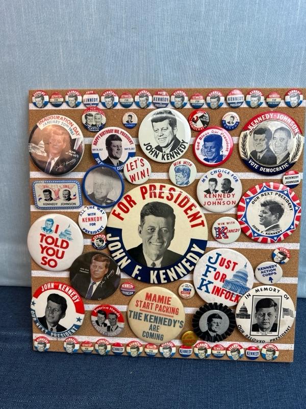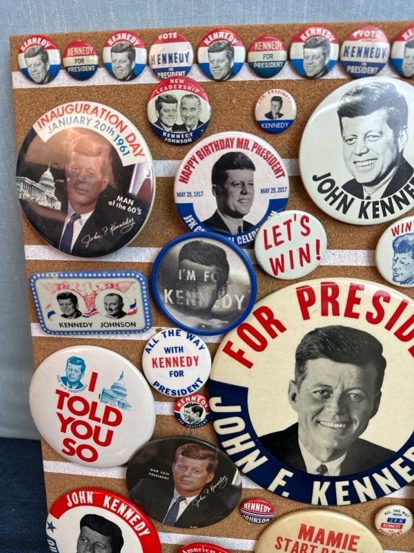 Lot 30 Kennedy button collection on 16 x 16 “ corkboard
