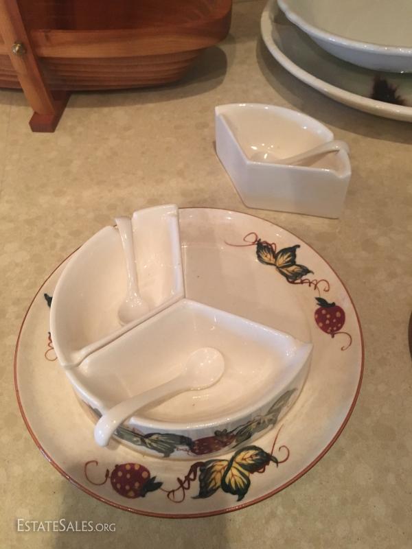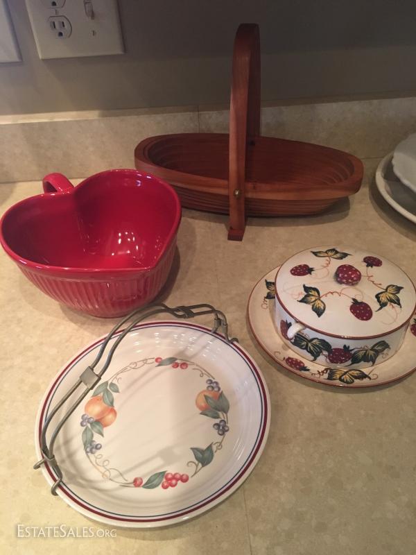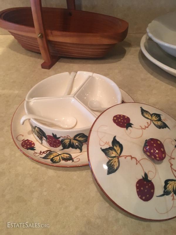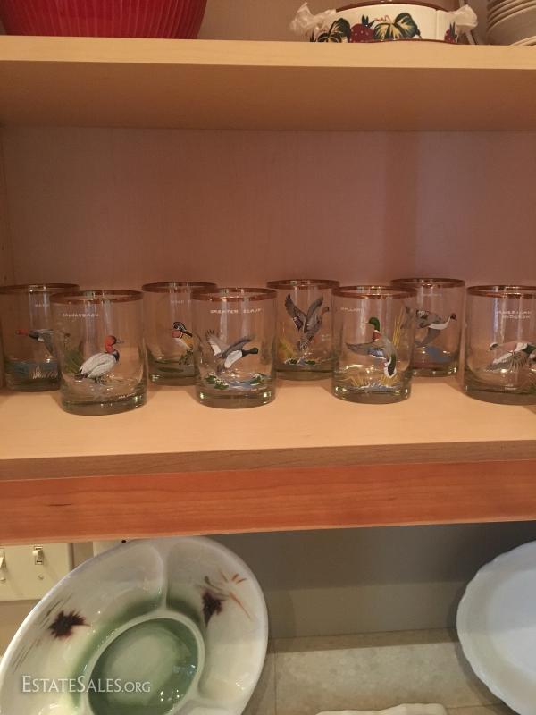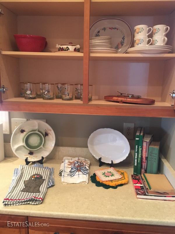 Set of eight bird glasses by Ned Smith, 25 pieces of Corelle, Fred Roberts cute strawberry motif condiment server with 3 spoons, 2 serving platters, red mixing/serving bowl, handmade wood, collapsible bowl, kitchen linens and misc books!