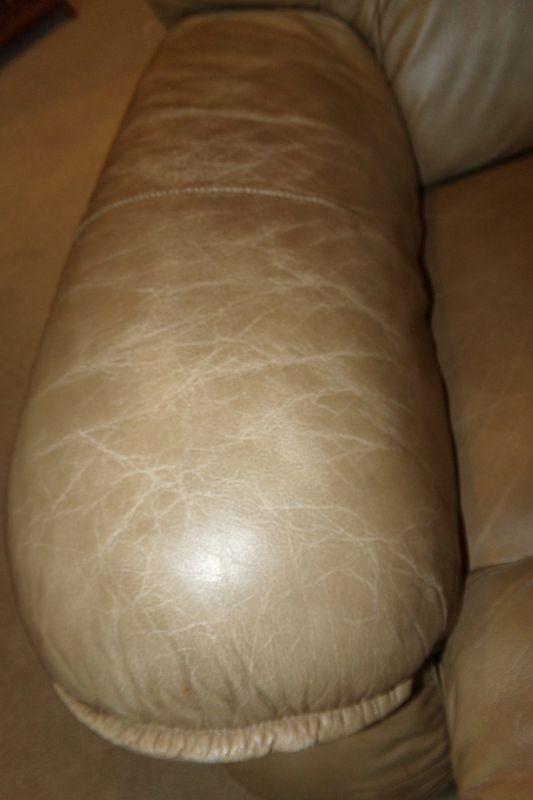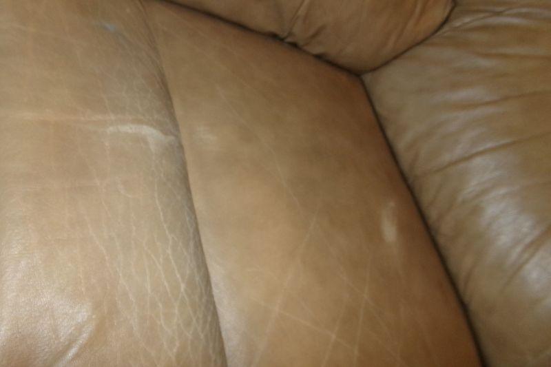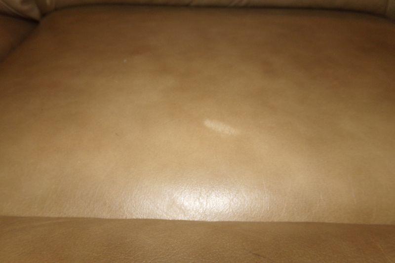 ONE SIDE HAS MORE WEAR ON THE ARMREST AND THE SEAT HAS A FEW SPOTS THAT ARE LIGHTER IN COLOR THAN THE TAN SOFA MEASURES 84" IN LENGTH