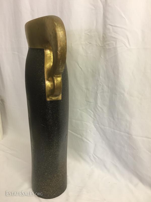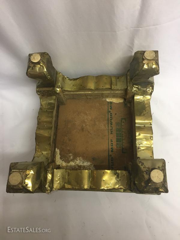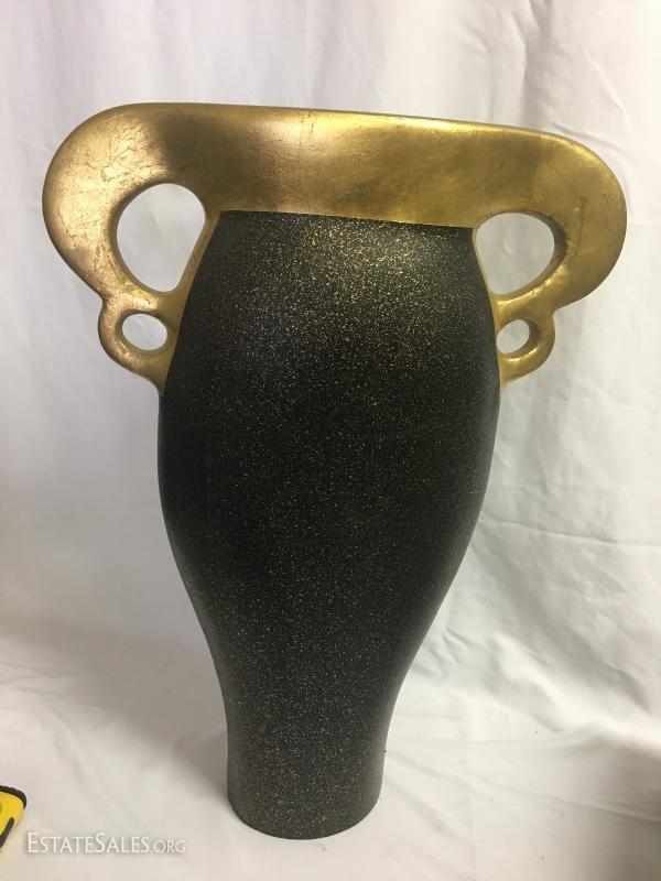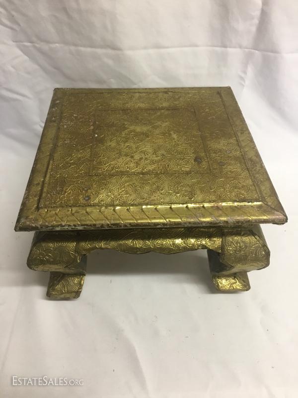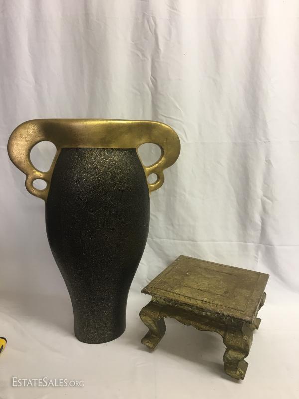 Vase is Gold and black and appears to be made of plaster. It measures 26" tall. Stool is wood and wrapped in embossed tin. Could also be used as a stand and is 7.5" tall and 12" x 12" on surface. This lot is available for shipping or local pick up in Waynesville, NC.
