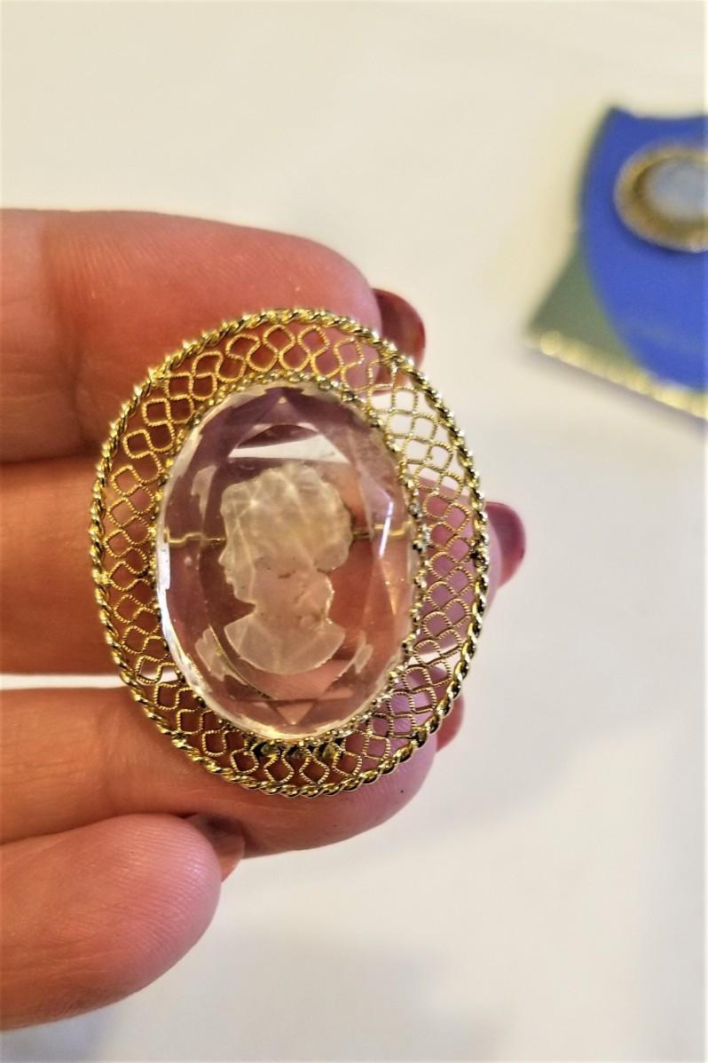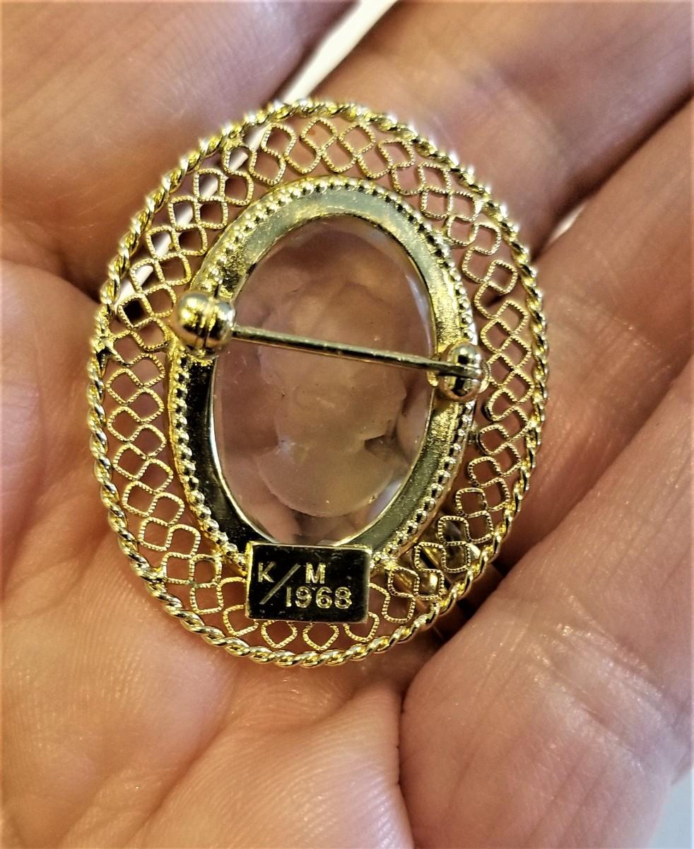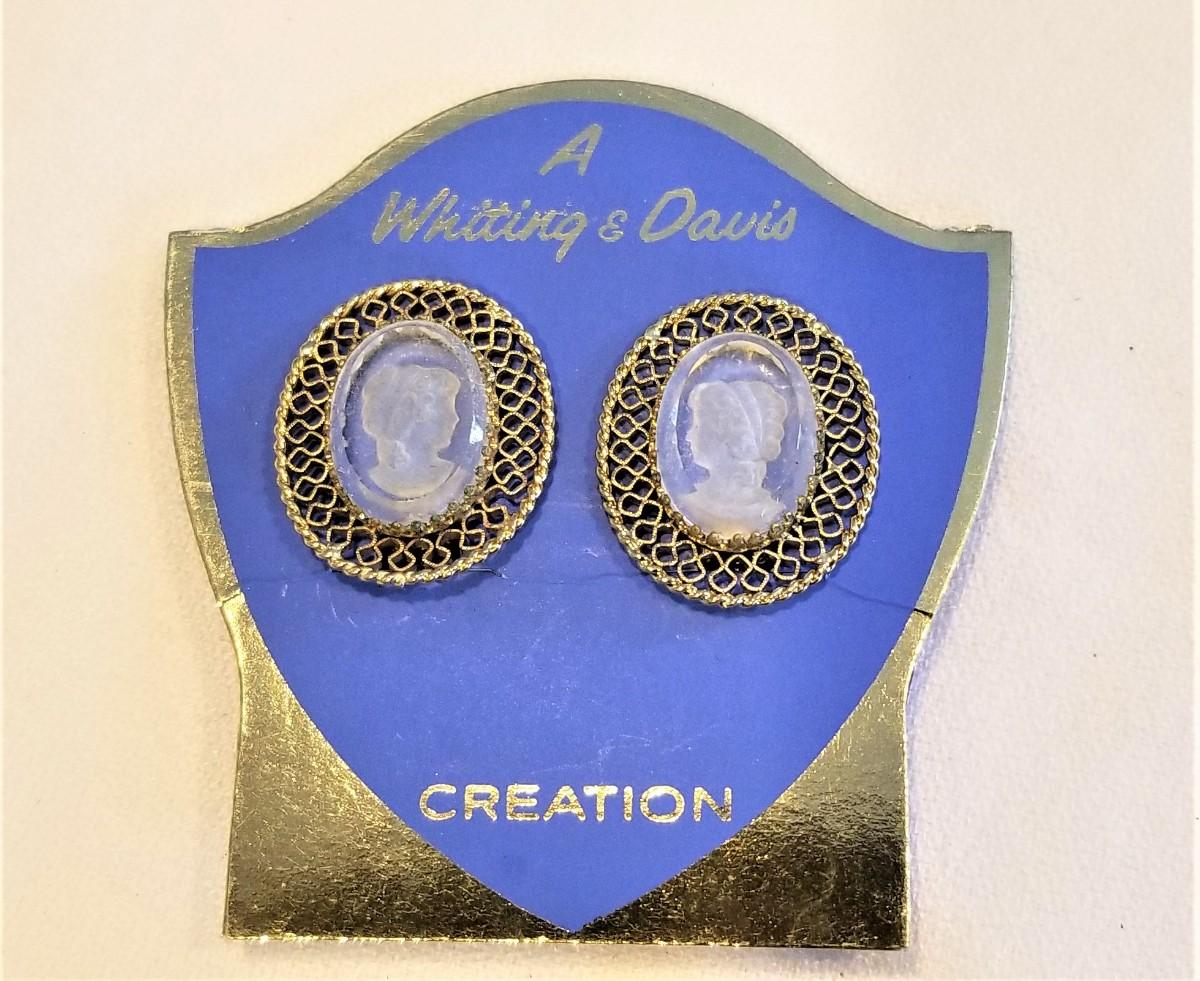 Nice vintage Whiting and Davis clip earring set with matching "cameo" brooch - earrings are on original card. The set is collectible in its own right, but it's also a Krewe Favor - dated 1968, K/M. There were several "M" krewes, including Knights of Momus, Mystery, and Krewe of Moslem - could be any one of those. Brooch is 1 inch long - all in vintage condition.