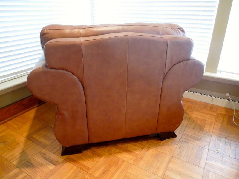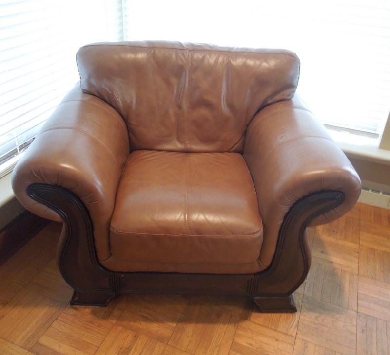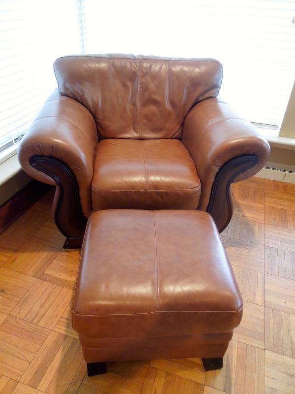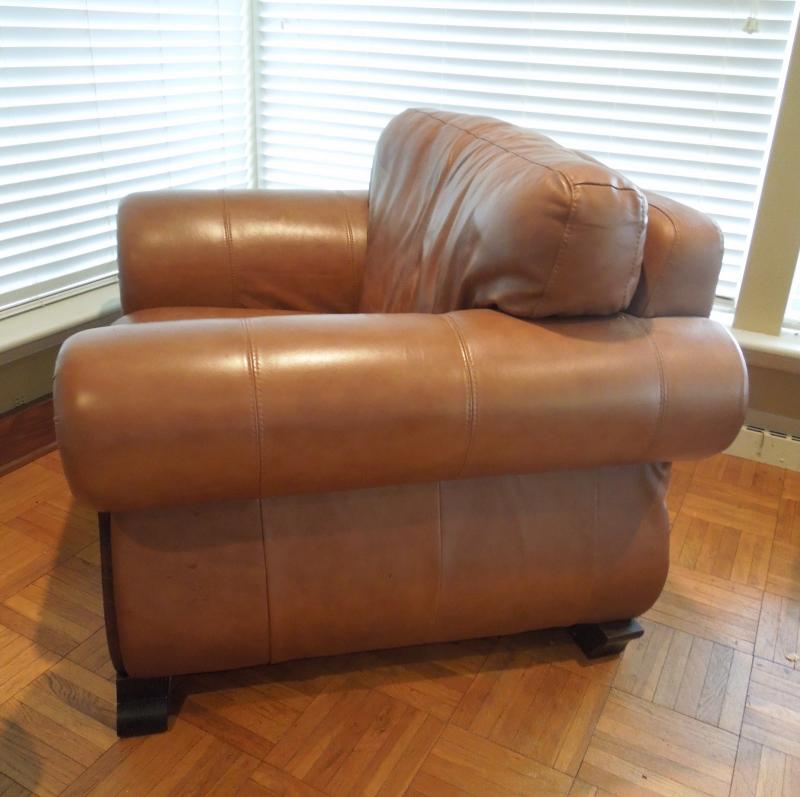 Nutmeg color synthetic leather roll arm chair and ottoman made by Due Linee Salotti in Italy. Chair has dark wood frame. One small area of upholstery has a whitish film on it. Did not attempt to remove. No rips or tears. 51" L X 40" W x 38" H chair. 25" x 23" x 17" ottoman.
